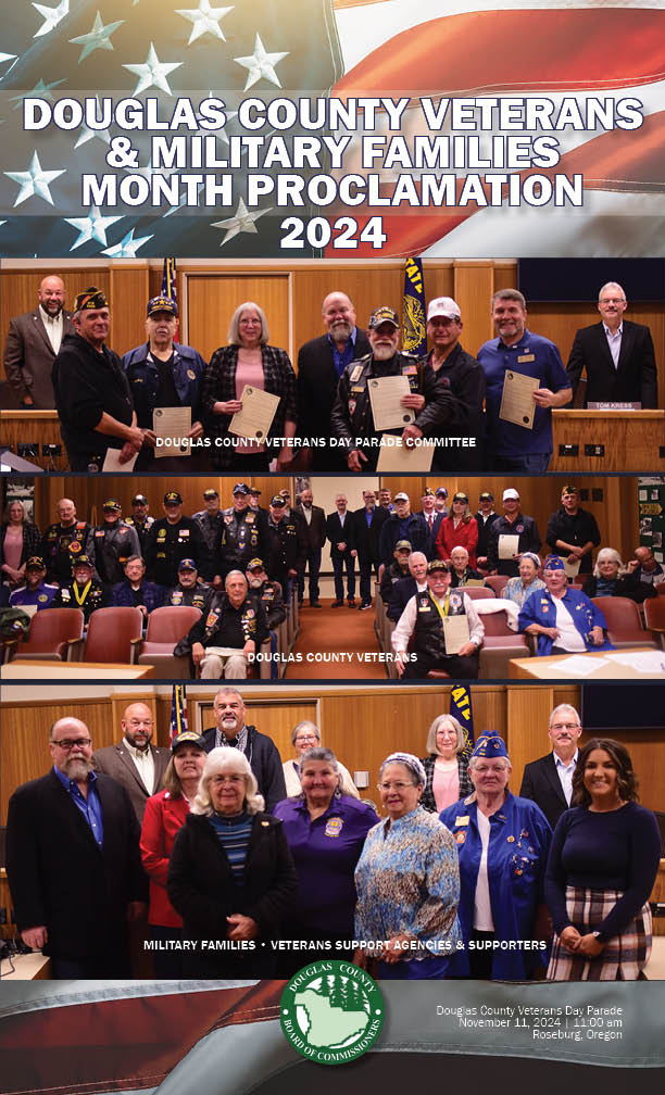 (Douglas County, Oregon) – The Douglas County Board of Commissioners issued a proclamation today, Wednesday, October 30, 2024, at the Weekly Business Meeting calling upon all citizens of Douglas County to celebrate and honor Veterans and Military Families Month. The proclamation also recognized and invited residents to honor all veterans on Veterans Day and attend the 69th Annual Douglas County Veterans Day Parade. Board Chair Commissioner Boice welcomed everyone to the meeting and said, “It is always a pleasure to have our Veterans here!” He then presented the proclamation, on behalf of the Board and acknowledged that, “since the establishment of the original 13 states, Americans have been willing to fight and die to preserve their individual rights as guaranteed in the United States Constitution and the Bill of Rights and we can never fully repay our debt of gratitude to those heroic men and women who served, were wounded, or died in battle.” A copy of the video presentation can be found on the Douglas County Government website: https://video.ibm.com/recorded/134059616.