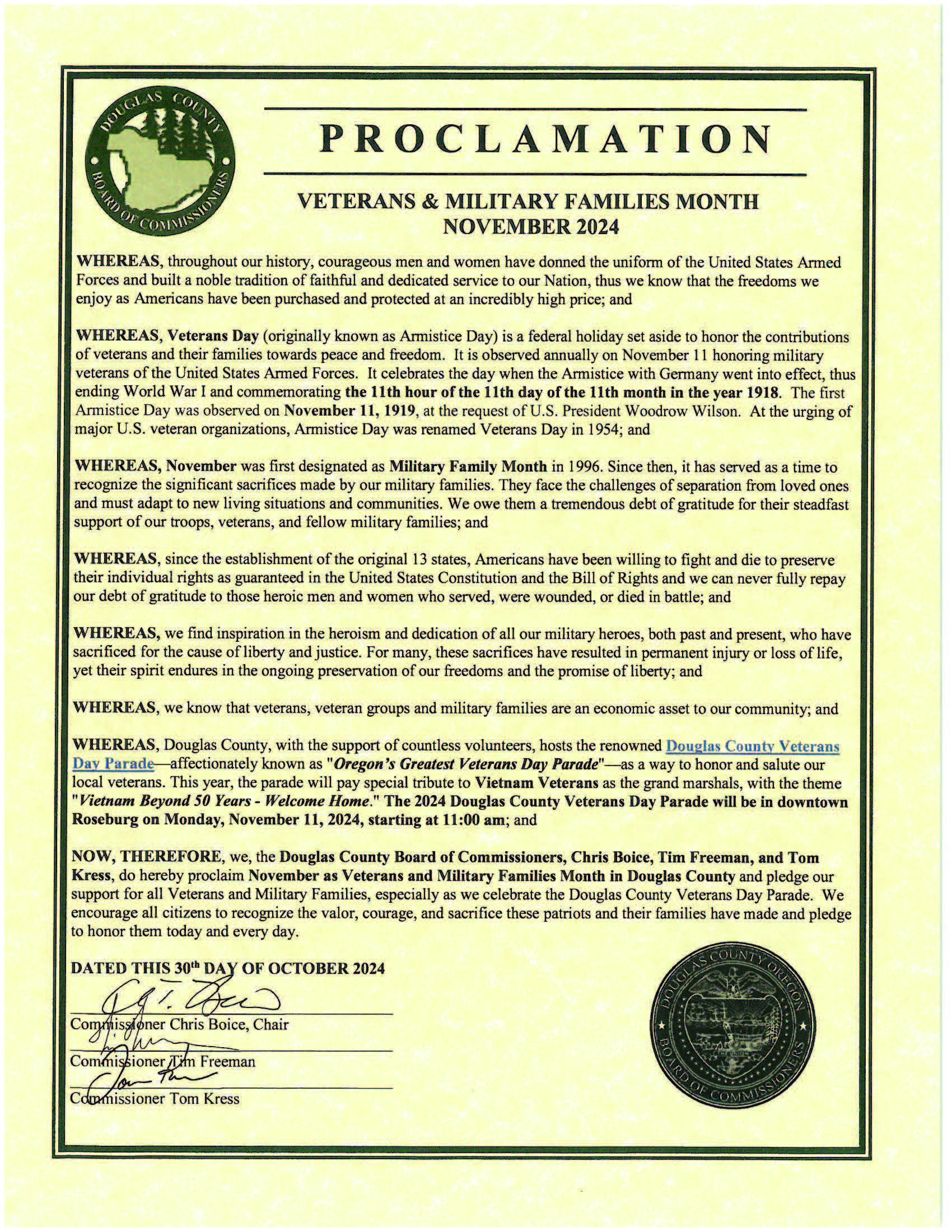 Please join us in honoring our veterans today and every day, but especially during the month of November, on Veterans Day and at the 69th Annual Douglas County Veterans Day Parade in downtown Roseburg, on Monday, November 11, 2024. For more information about the parade click on the link here. The proclamation presented today is a reminder for our citizens to recognize the valor, courage, and sacrifice these patriots and their families have made. It also a time to rededicate ourselves to the preservation of our liberties under the Constitution of the United States.
