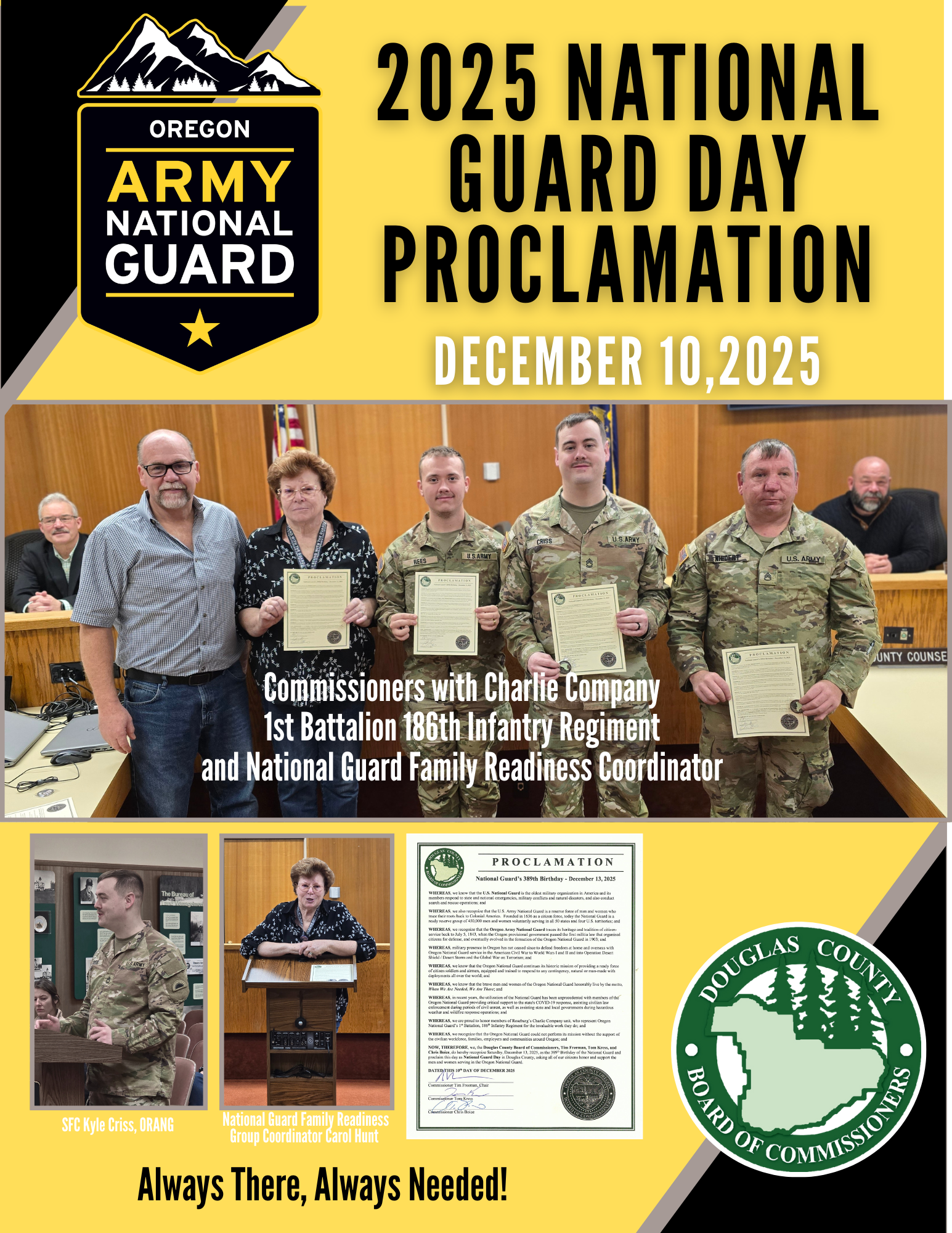 (Douglas County, Ore.) – The Douglas County Board of Commissioners issued a proclamation today, Wednesday, December 10, 2025 at the Weekly Business Meeting calling upon all citizens of Douglas County to observe National Guard Day, in celebration of the National Guard‘s upcoming 389th Birthday on December 13, 2025. Commissioners were honored to recognize the men and women who bravely serve our communities and nation in the Army National Guard. The proclamation was presented by Commissioner Boice, on behalf of the Board and acknowledged that, “The U.S. National Guard is the oldest military organization in America, and its members respond to state and national emergencies, military conflicts and natural disasters, and conduct search and rescue operations. The U.S. Army National Guard is a reserve force of men and women who trace their roots back to Colonial America. Founded in 1636 as a citizen force, today the National Guard is a ready reserve group of 450,000 men and women voluntarily serving in all 50 states and four U.S. territories. The Oregon Army National Guard traces its heritage and tradition of citizen-service back to July 5, 1843, when the Oregon provisional government passed the first militia law that organized citizens for defense, and eventually evolved in the formation of the Oregon National Guard in 1903.” A copy of the video presentation can be found on the Douglas County Government Facebook page: https://www.facebook.com/DouglasCountyeGovernment.
