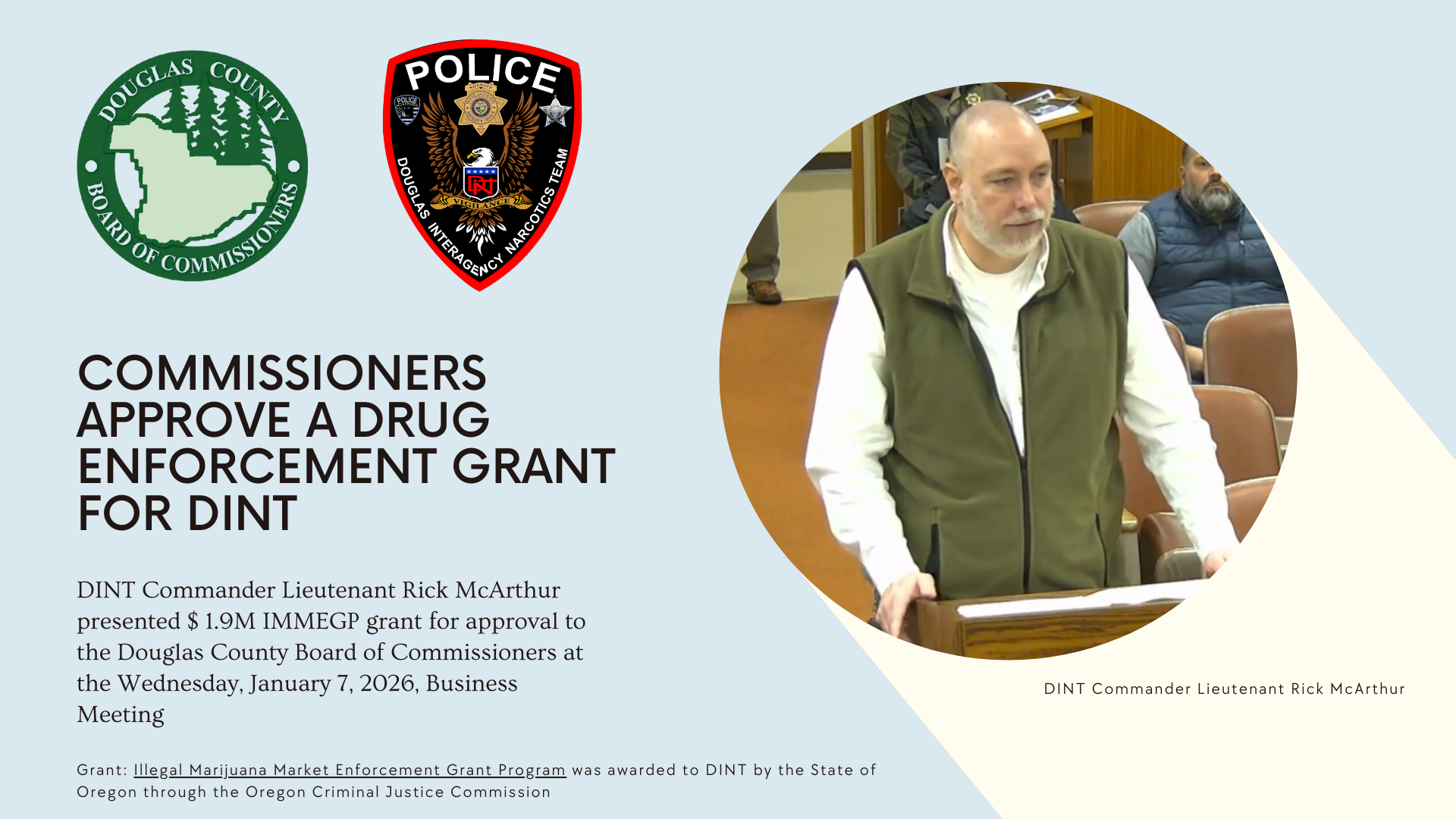 (Douglas County, Ore) Douglas County Commissioners are pleased to announce that earlier this week they approved the acceptance of a renewal grant for the Douglas Interagency Narcotics Team (DINT).  DINT under the command of Lieutenant Rick McArthur received a grant from the Illegal Marijuana Market Enforcement Grant Program (IMMEGP). The grant, awarded by the State of Oregon through the Oregon Criminal Justice Commission (CJC), totals $1,945,652 and is the next cycle of an existing grant from the CJC that will support illegal marijuana enforcement efforts in Douglas County through August 31, 2027.