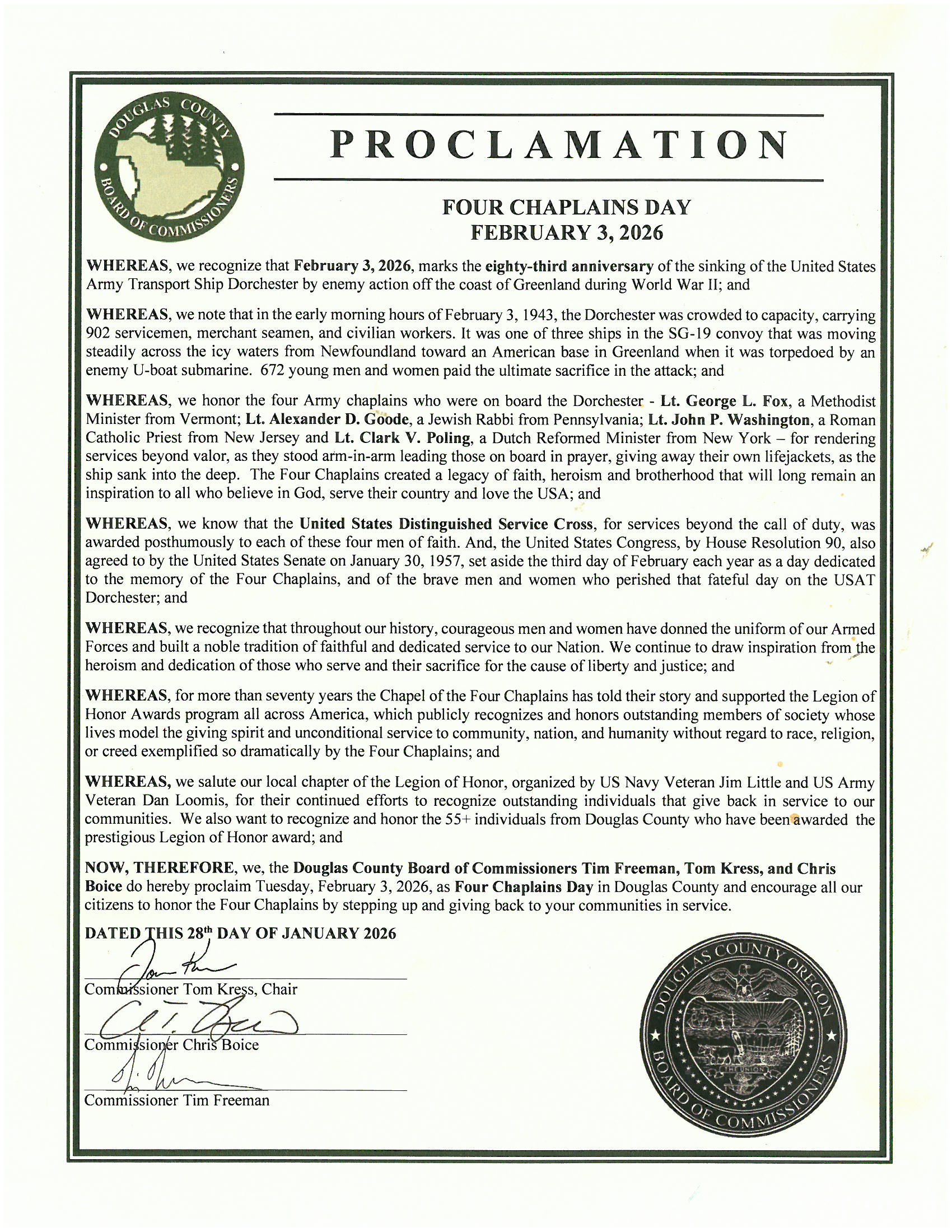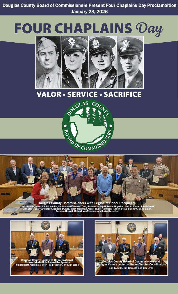 (Douglas County, Ore.) – Douglas County Commissioners Tom Kress, Chris Boice, and Tim Freeman issued a proclamation on Wednesday, January 28, 2026, at the Weekly Business Meeting calling upon all citizens of Douglas County to observe Four Chaplains Day, on Tuesday, February 3, 2026. For more than seventy years the Chapel of the Four Chaplains has told their story and supported the Legion of Honor Awards program all across America, which publicly recognizes and honors outstanding members of society whose lives model the giving spirit and unconditional service to community, nation, and humanity without regard to race, religion, or creed exemplified so dramatically by the Four Chaplains. A copy of the video presentation can be found on the Douglas County Government Facebook page: https://www.facebook.com/DouglasCountyeGovernment.