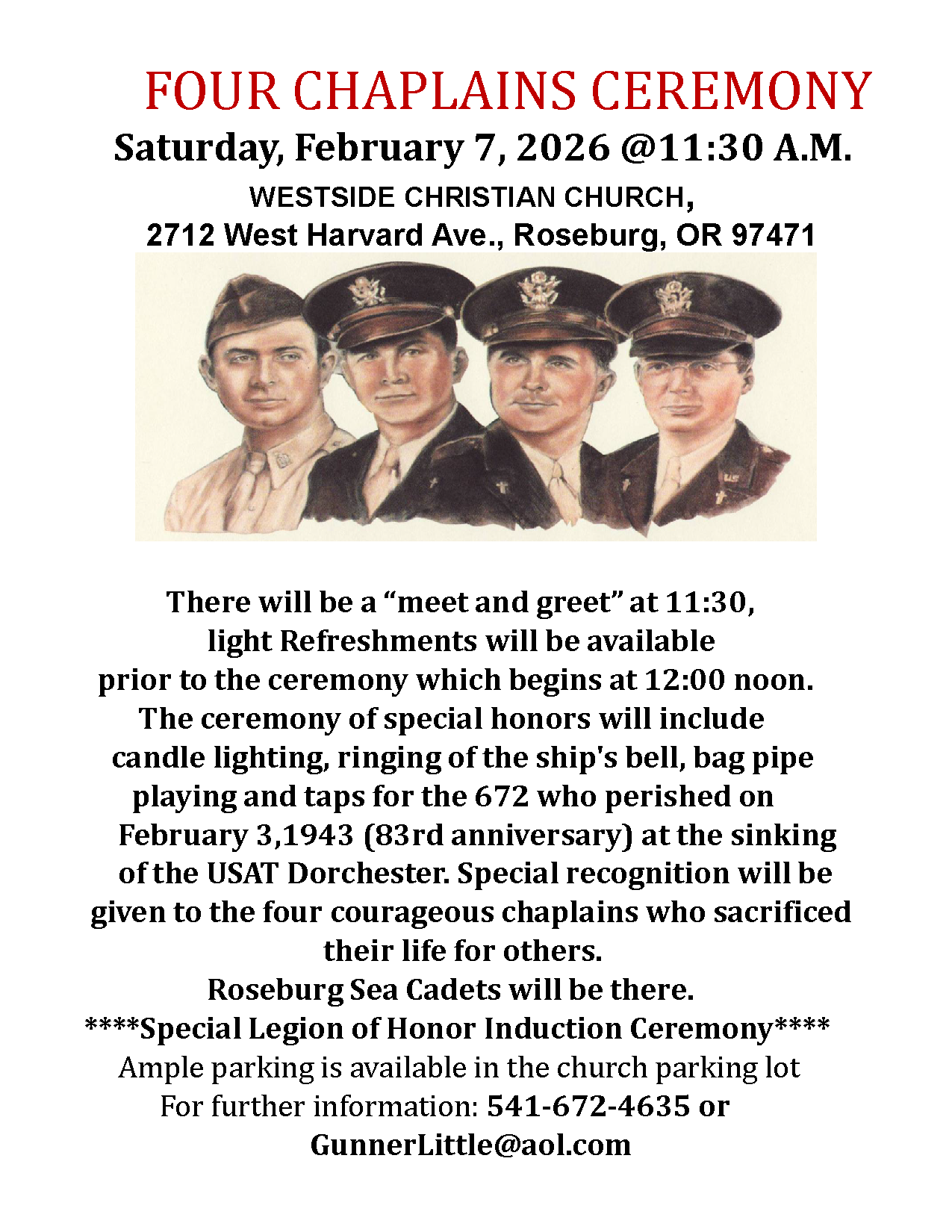 Douglas County Commissioners proclaimed Tuesday, February 3, 2026, as Four Chaplains Day in Douglas County and encouraged all our citizens to honor the Four Chaplain’s and the memory of those who perished on the Dorchester that day by stepping up and giving back to your communities in service. They also encourage you to attend the 14th Annual Four Chaplains Event at Westside Christian Church in Roseburg on Saturday, February 7, 2026, starting at 11:30 am. To learn more about the Legion of Honor and the Chapel of Four Chaplains log onto their website: http://fourchaplains.org/.