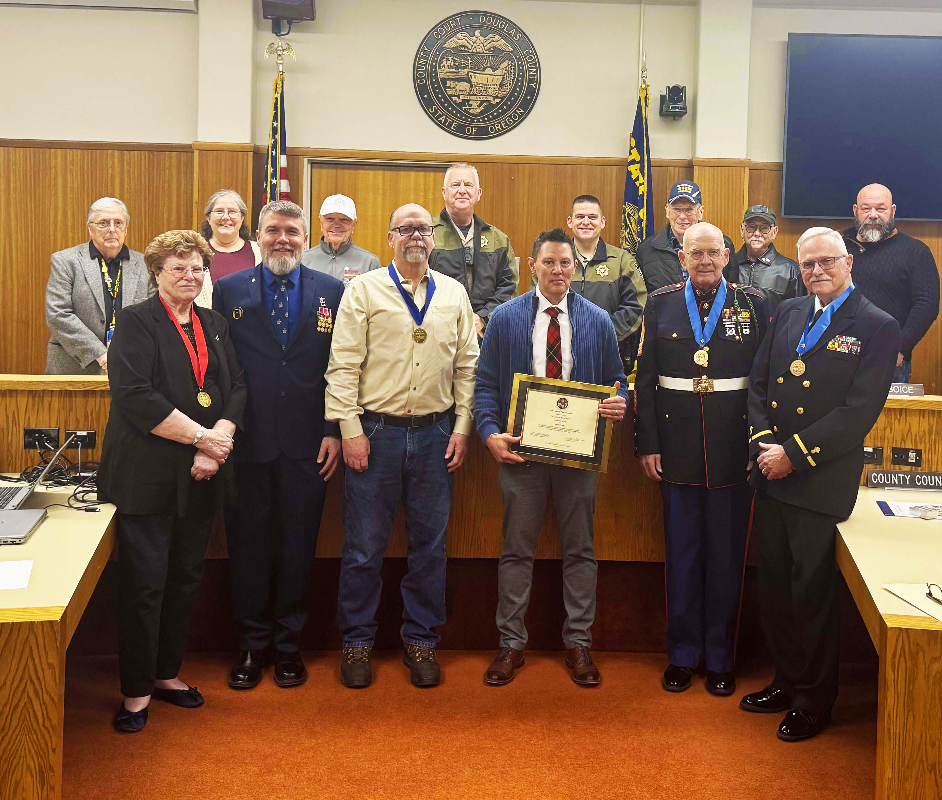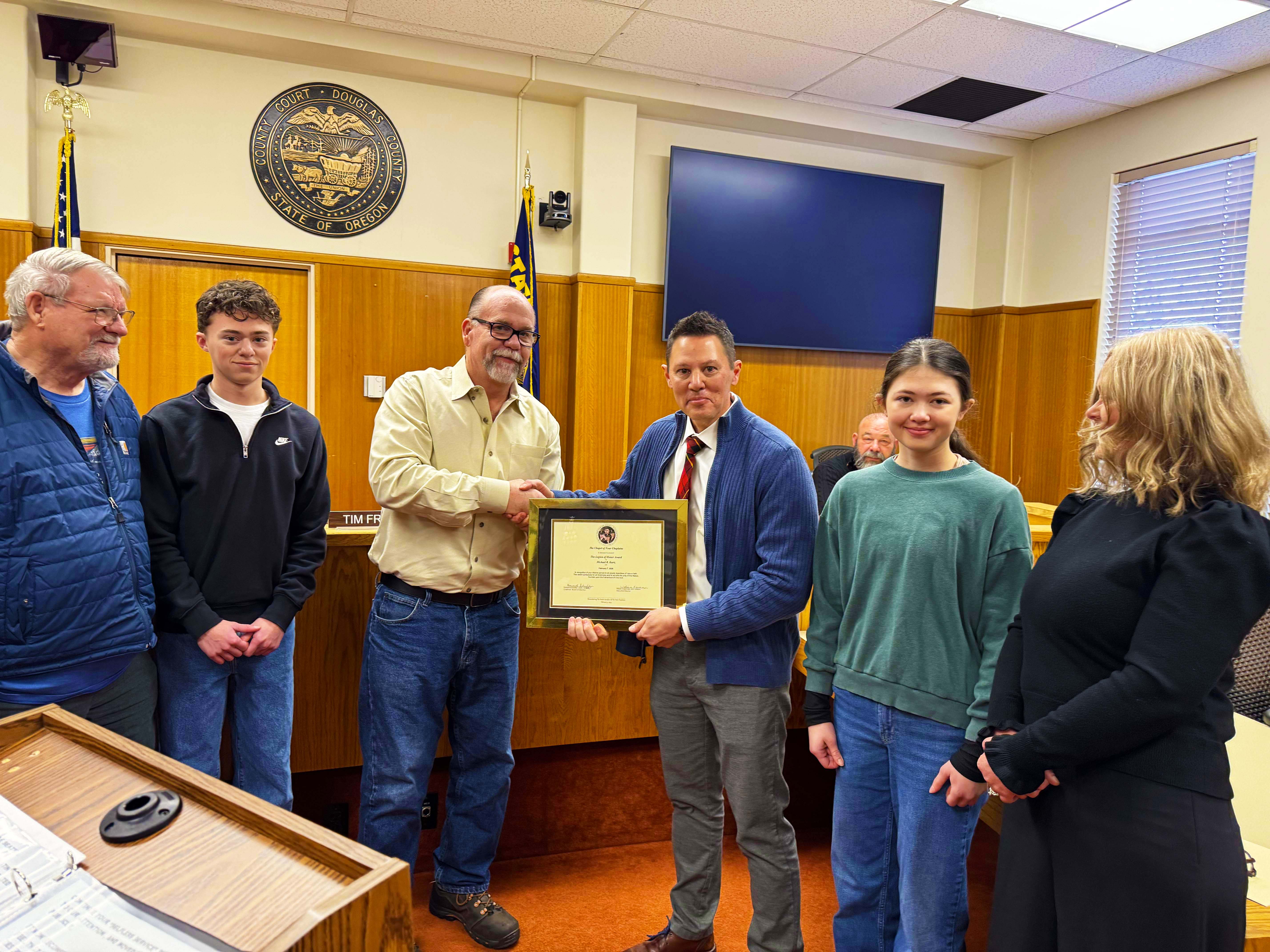 (Douglas County, Ore.) Douglas County Commissioners Tom Kress, Chris Boice, and Tim Freeman are excited to recognize and congratulate Douglas County Human Resources Director Michael Kurtz as the latest recipient of the prestigious Four Chaplains Legion of Honor award. Kurtz was surprised with the award at a special presentation on February 18, 2026, at the Board of Commissioners Weekly Business Meeting held at the Douglas County Courthouse in Roseburg. Kurtz joins four other 2025/26 Four Chaplains award winners who received awards on February 7, 2026, at the local Four Chaplains ceremony.