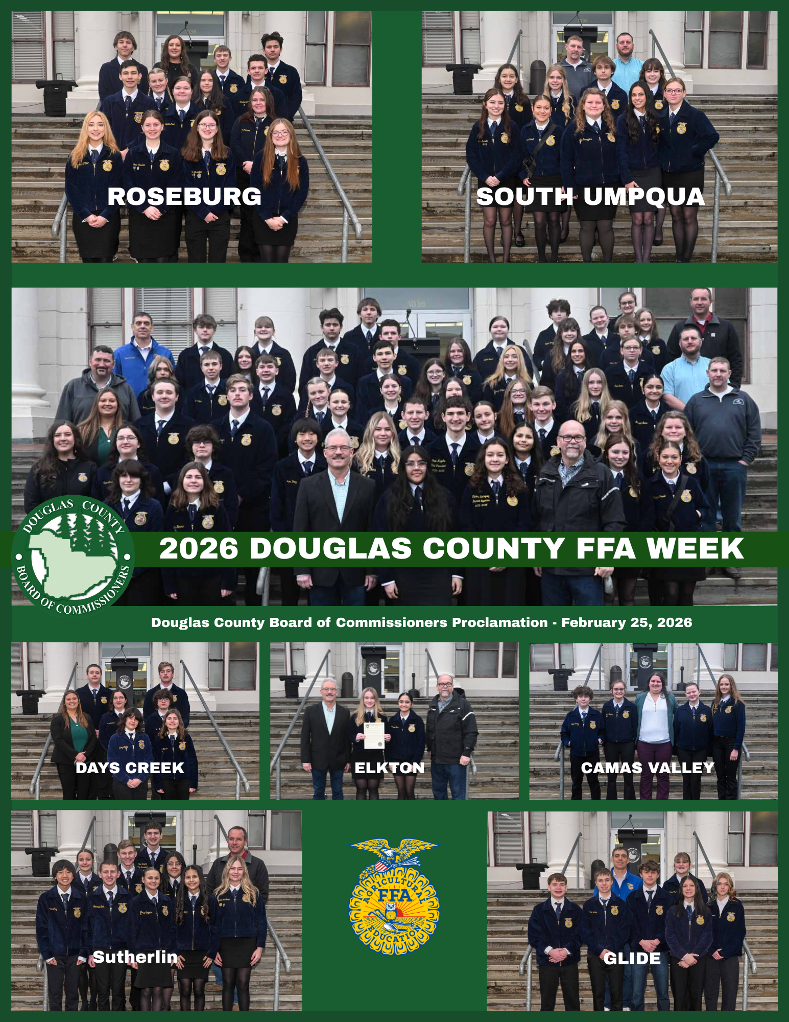 (Douglas County, Ore.) Douglas County Commissioners Tom Kress, Chris Boice, and Tim Freeman are pleased to issue a proclamation recognizing February 21-28, 2026, as FFA Week in Douglas County prior to and during their weekly business meeting on Wednesday, February 25, 2026, at the Douglas County Courthouse. The proclamation was read by Commissioner and Board Chair Tom Kress on behalf of all three Commissioners and recognizes the important role that the FFA youth programs and agricultural education classes in our local high schools play in providing a strong foundation for youth to excel in leadership roles, realize personal goals, and obtain valuable tools to prepare them for real-world success. A copy of the outdoor and indoor video presentations can be found on the Douglas County Government Facebook page facebook.com/DouglasCountyeGovernment or on our YouTube Channel youtube.com/watch?v=UGZyJQLZUns.