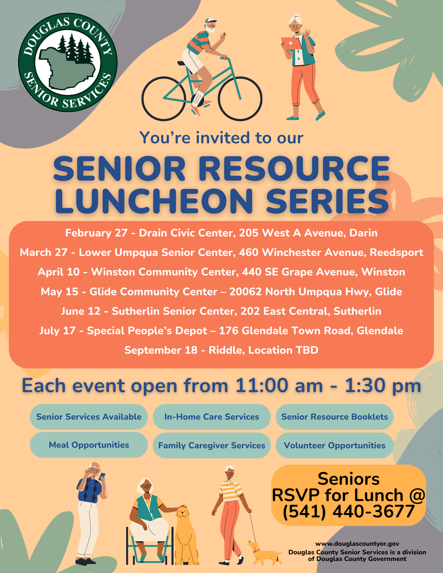 Each event will be open from 11:00 a.m. to 1:30 p.m. and will include an opportunity for seniors to enjoy lunch at participating locations. The first event in the series took place at the Drain Civic Center on February 27, 2026. Seniors who plan to attend lunch are asked to RSVP by calling (541) 440-3677.