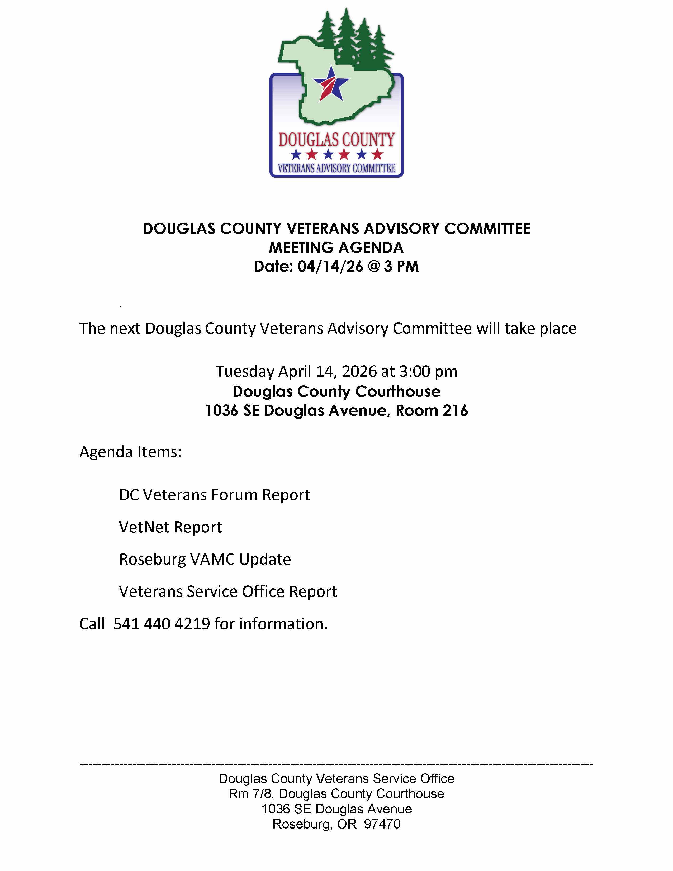 For additional information about this meeting, please contact the Douglas County Veteran Service Office by calling (541) 440-4219 or by email at veterans@douglascountyor.gov. The meeting agenda can be found at https://douglascountyor.gov/. The Douglas County Veteran Service Office is a division of Douglas County government.