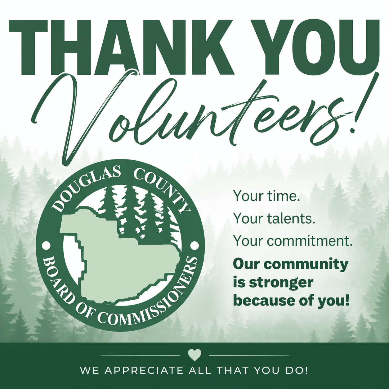 A Community Effort: “Volunteers are truly the heart of Douglas County,” stated Commissioner Tim Freeman. “Whether they are serving on advisory boards, delivering meals, responding in emergencies, or supporting community events, their dedication makes a real and lasting difference. We are incredibly grateful for the time, energy, and compassion they give to help keep our communities strong.”