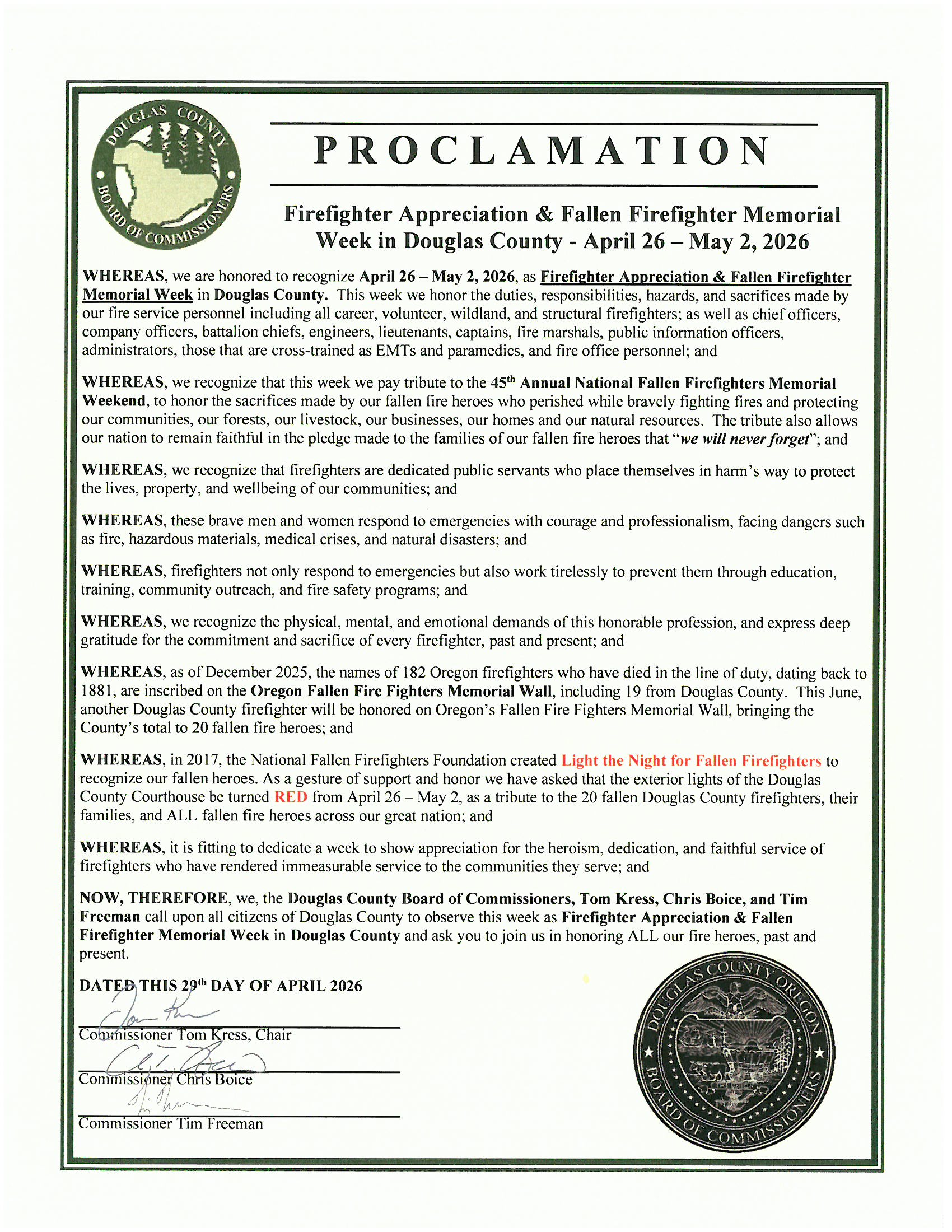 (Douglas County, Ore.) Douglas County Commissioners Tom Kress, Chris Boice, and Tim Freeman issued a proclamation today at their Weekly Business Meeting calling upon all citizens of Douglas County to observe April 26 – May 2, 2026, as "Firefighter Appreciation & Fallen Firefighter Memorial Week" in Douglas County. The proclamation was presented by Commissioner Kress, on behalf of the Board and acknowledged that, “We recognize that firefighters are dedicated public servants who place themselves in harm’s way to protect the lives, property, and wellbeing of our communities. These brave men and women respond to emergencies with courage and professionalism, facing dangers such as fire, hazardous materials, medical crises, and natural disasters. Firefighters not only respond to emergencies but also work tirelessly to prevent them through education, training, community outreach, and fire safety programs. We recognize the physical, mental, and emotional demands of this honorable profession, and express deep gratitude for the commitment and sacrifice of every firefighter, past and present.” A copy of the live video presentation can be found on the Douglas County Government Facebook page: https://www.facebook.com/DouglasCountyeGovernment and our YouTube channel at www.youtube.com/watch?v=MlTPMEiNtsg&t=1489s.
