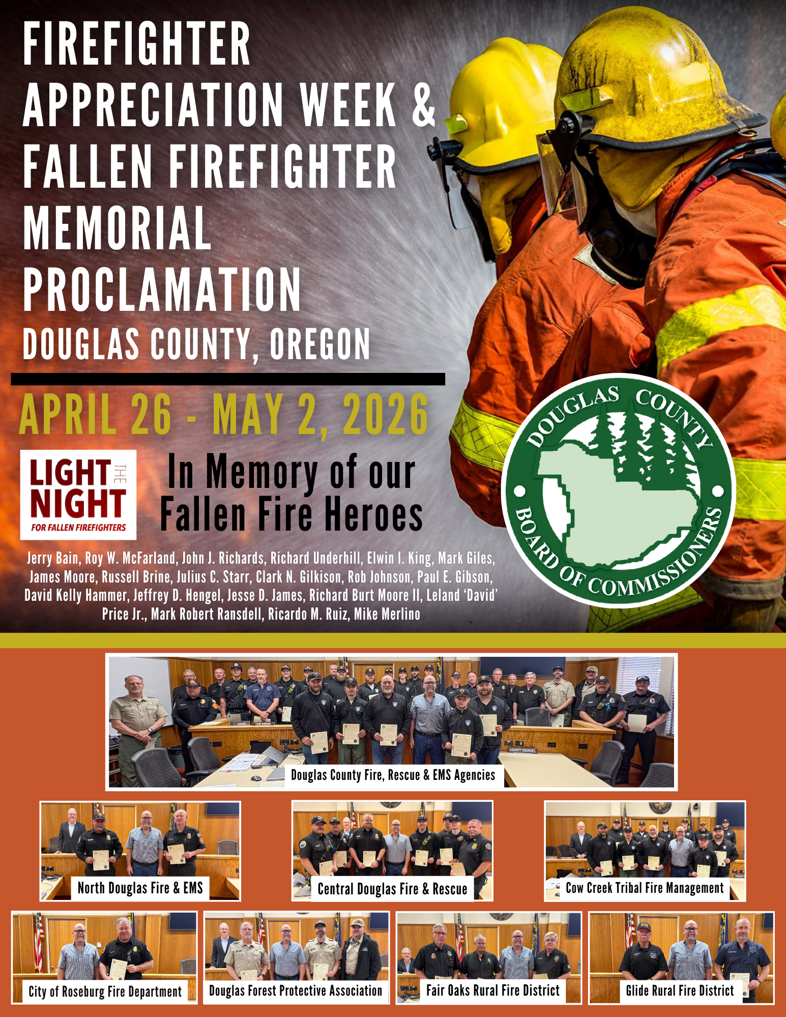 “Commissioners thank you for this and I want to recognize that I have been doing this for a while now and the amount of effort and things that I see firefighters run into to help other people is incredible. They sacrifice a lot – not always with their life, but time with their family, time with their friends and their free time. Being a firefighter is a lifestyle, not just a job. Everybody here gives everything they can to the people we serve. To be remembered and honored is like this is nice. I want to thank you and everyone here for the effort they put forth, be it paid, volunteer, wildland, structural or EMS, ” - Chief Rob Bulluck, Central Douglas Fire & Rescue.