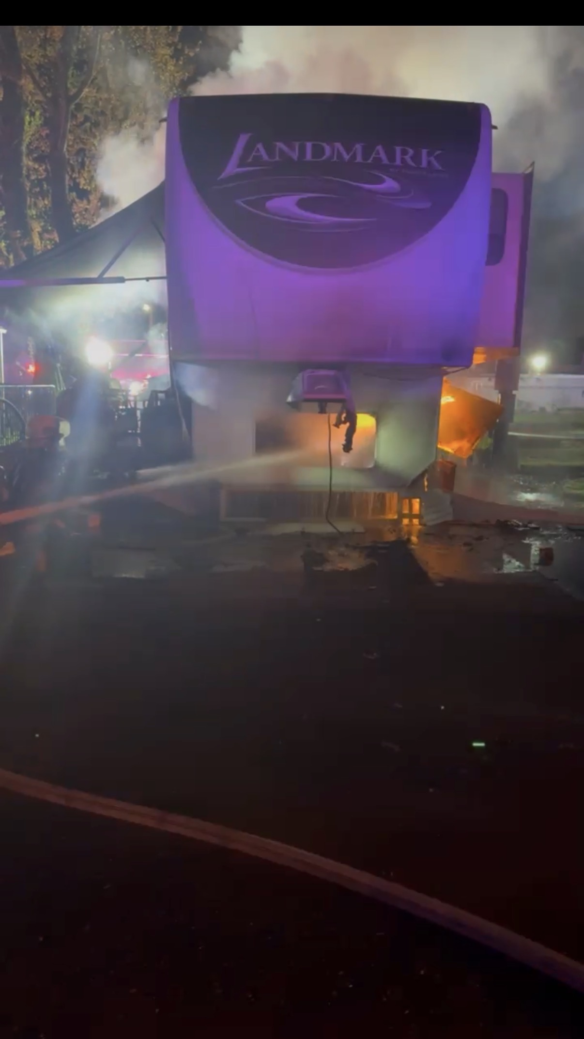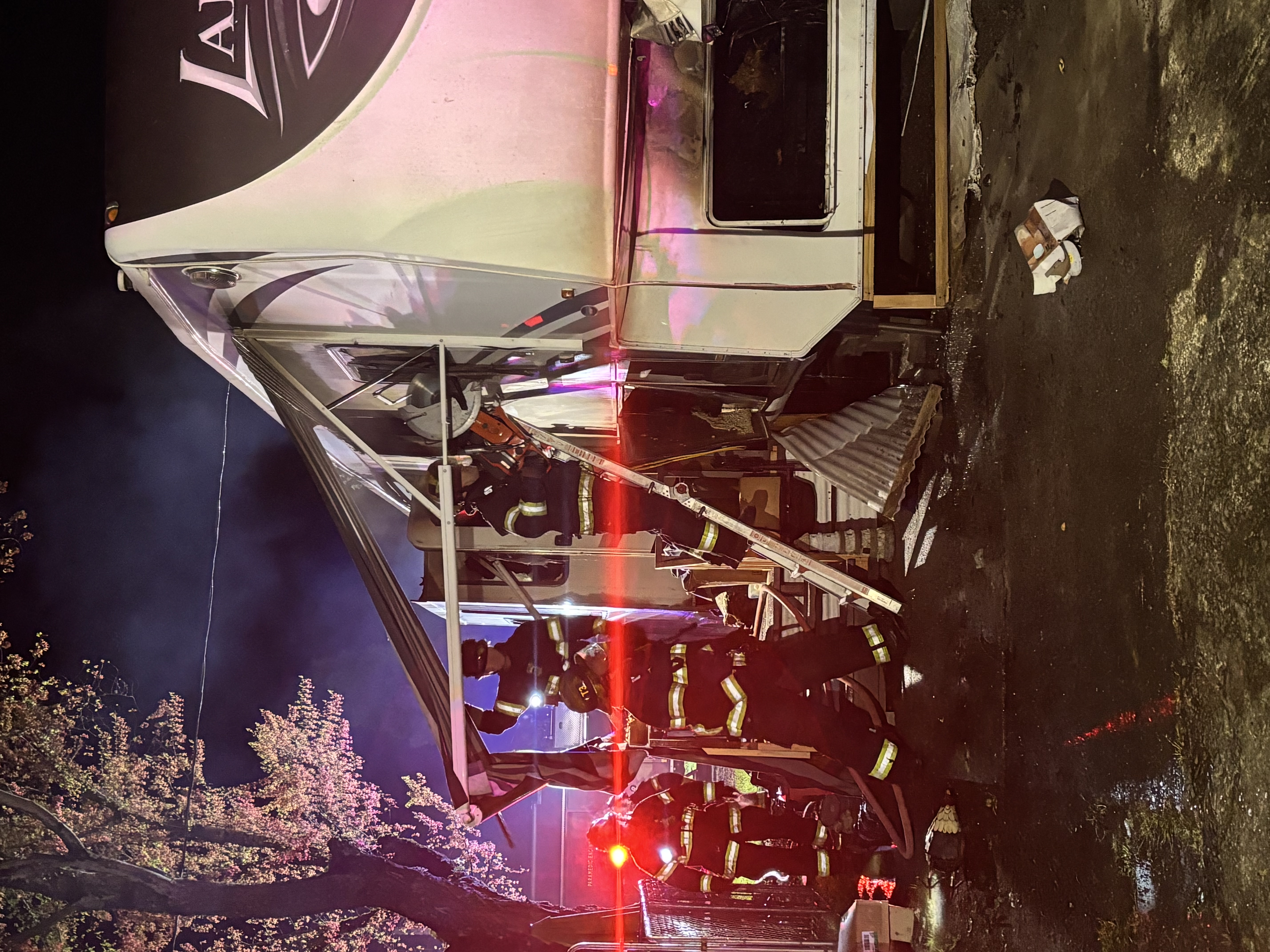 Shortly after midnight, Eugene Springfield Fire units were dispatched to a reported RV fire in the 700 block of 28th Street. Battalion 3 and Engine 14 arrived on scene in under two minutes to find a working fire with two occupants who had self-extricated from the structure prior to crews' arrival.