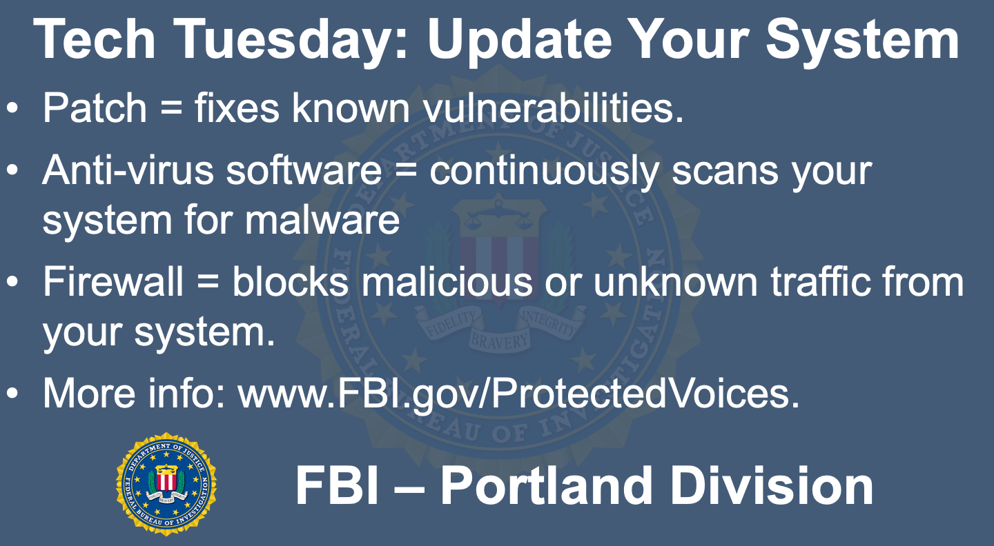 Welcome to the Oregon FBI’s Tech Tuesday segment. This week: building a digital defense patch by patch.