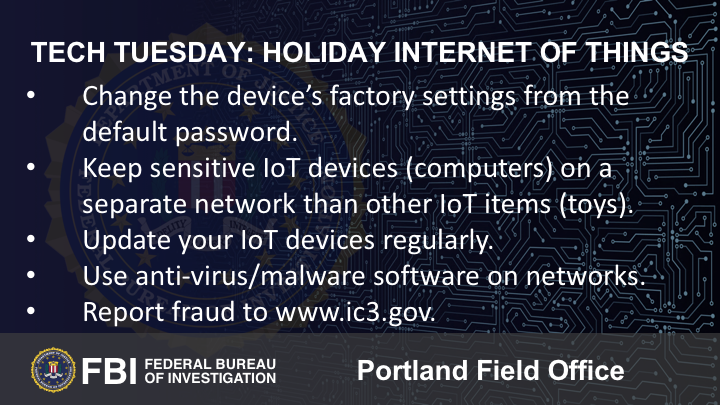 Welcome to the Oregon FBI’s Tech Tuesday segment. Today: Building a digital defense against all of those Internet of Things that are sitting under your tree right now.