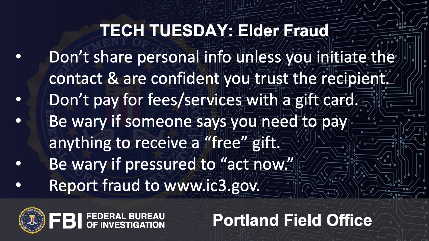 Welcome to the Oregon FBI’s Tech Tuesday segment. This week: a look at how to help senior citizens build a digital defense against elder fraud.