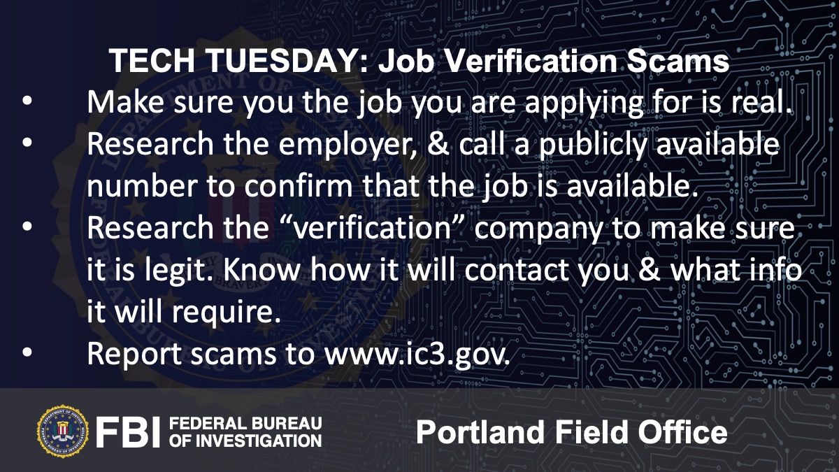 Oregon FBI Tech Tuesday: Building A Digital Defense Against Job Verification Scams (Photo) - 01/11/22