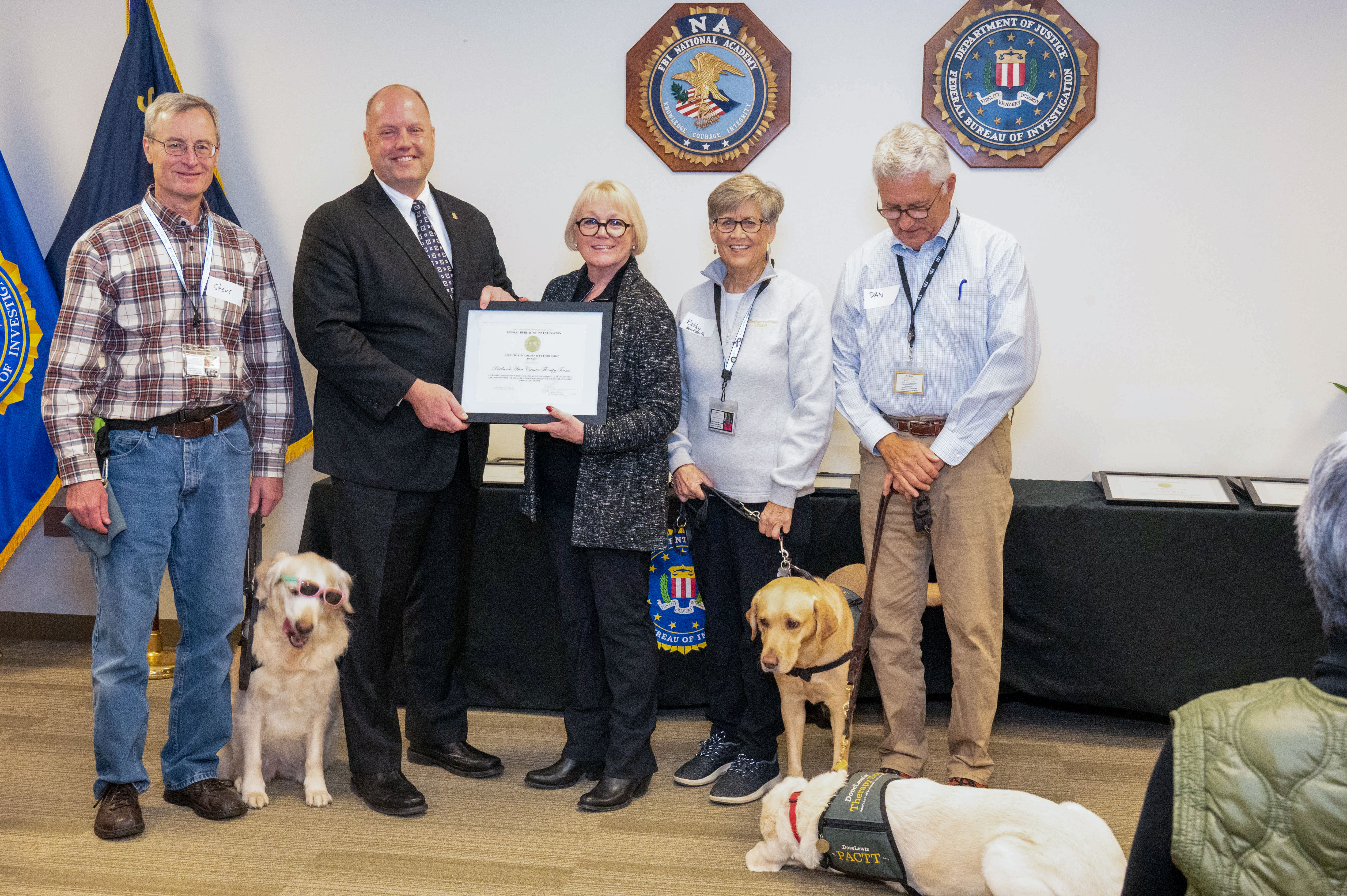 In May, 2023, FBI Director Christopher Wray presented DoveLewis’ Portland Area Canine Therapy Teams (PACTT) with the FBI Director’s Community Leadership Award (DCLA) for their service to the people of Portland, OR. Receiving the award on behalf of DoveLewis was Kathy Loter, the program manager of PACTT. This organization spends thousands of hours in schools, courtrooms, hospitals, and care centers every year furthering human health through positive interactions with dogs. FBI Portland is proud to honor PACTT in our home state at the Community Awards Ceremony.