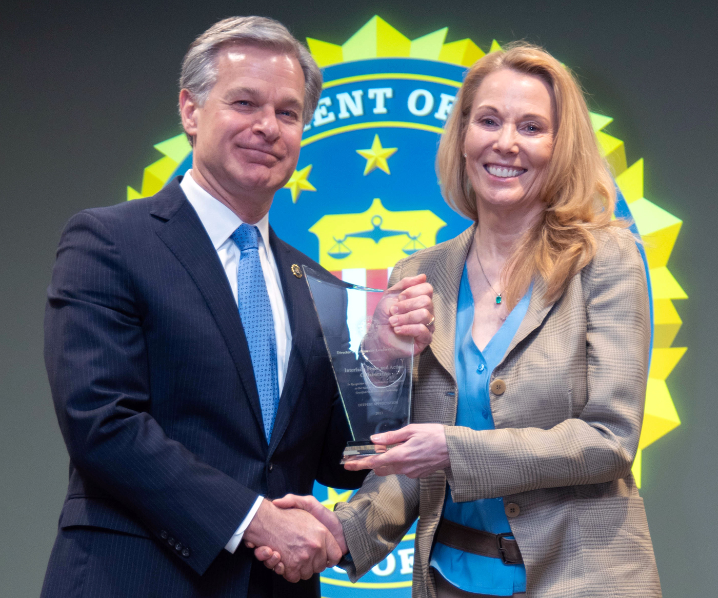 PORTLAND, OREGON– On Friday, April 19, 2024, FBI Director Christopher Wray presented the Interfaith Peace and Action Collaborative (IPAC) with the FBI Director’s Community Leadership Award (DCLA) for their service to the Portland area. Lisa Broderick accepted the FBI Portland 2023 Director’s Community Leadership Award on behalf of IPAC. IPAC is a united group that proactively gathers as members of faith, community, business, and law enforcement to discuss and create action around bringing peace to Portland’s streets. The group researches best practices and identifies appropriate actions, technology, and street-level solutions to address violence at a grassroots level. IPAC is also working to become a model for, and share information with, other cities that are struggling with an uptick in crime.
