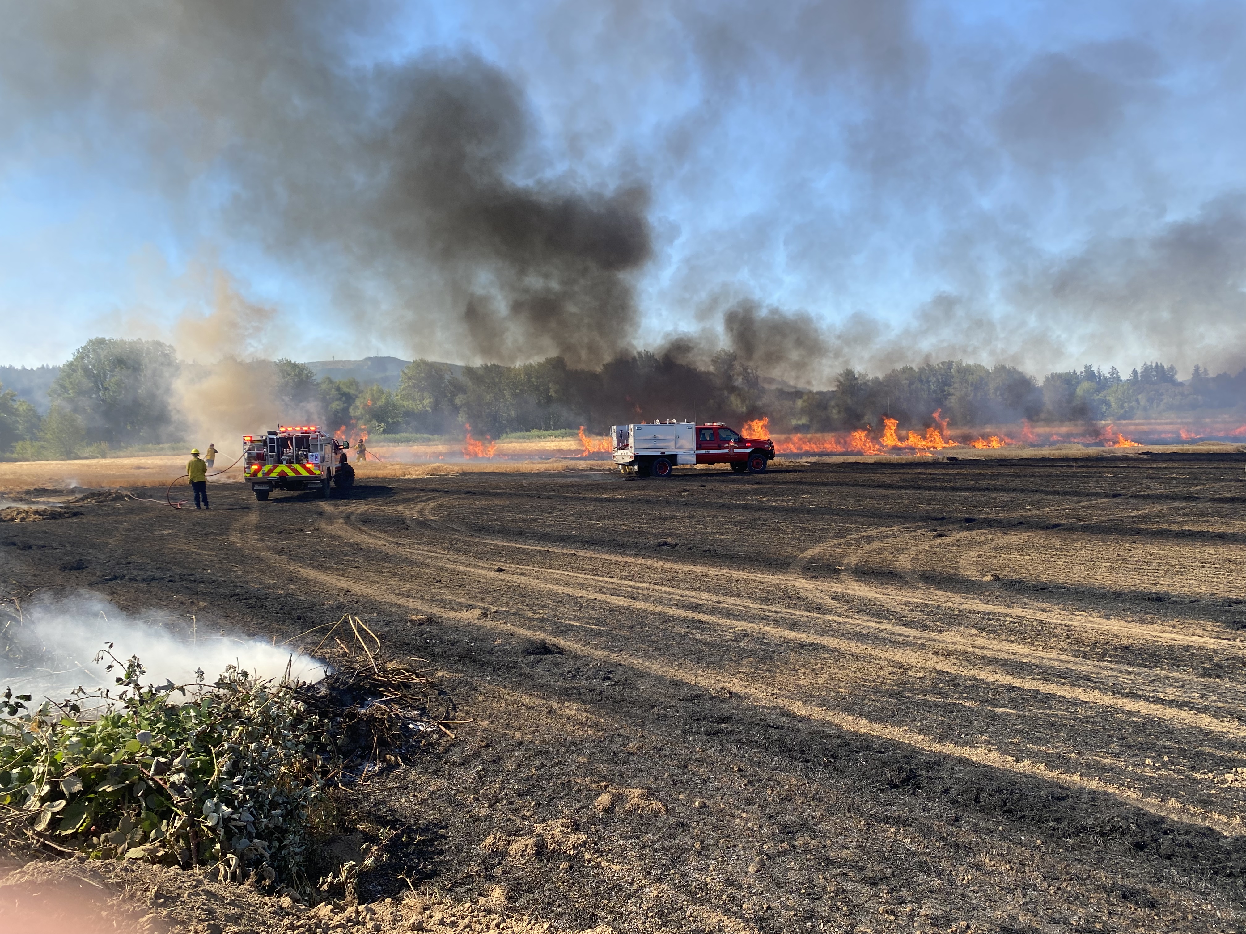 This afternoon at 2:47pm, Forest Grove Fire & Rescue was dispatched to a reported brush fire on SW Spring Hill Road near Sandstrom Road, in rural Washington County. Crews arrived shortly after to find fire burning on both sides of Spring Hill Road. One side was a ditch line/hill close to a house and the other was a large recently cut wheat field. As firefighters arrived on scene, they began to fight the growing fire. They quickly extinguished the fire near the house and concentrated all efforts of the burning field. A moderate wind allowed the fire to spread quickly in the dry field, additional resources were needed and incident command called for a 2nd Alarm.