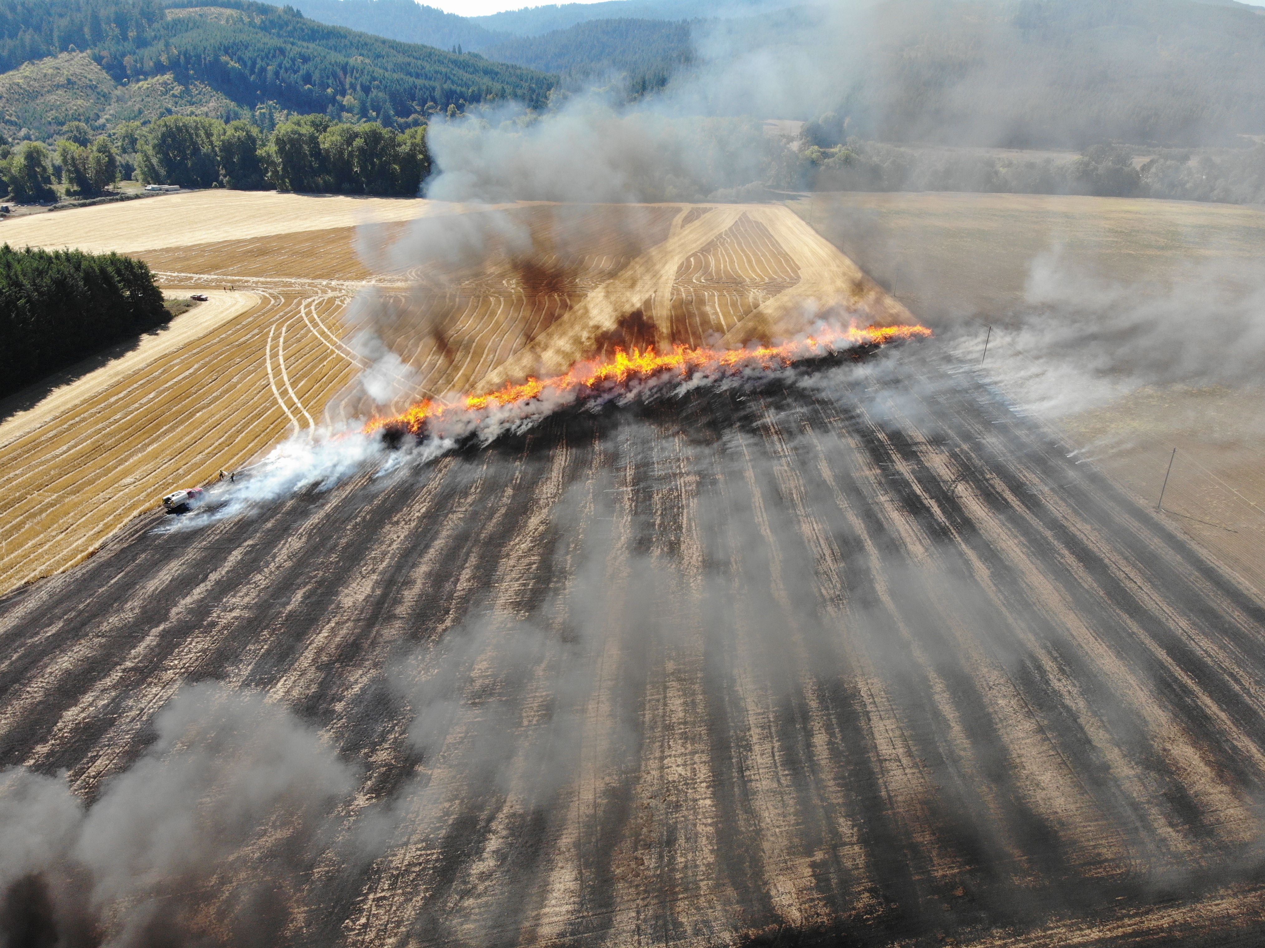 At 2:26pm on Tuesday September 16th, Forest Grove Fire & Rescue was dispatched to a field fire on NW Gales Creek Road, west of the intersection to Mystic Drive. Reports were that a field was on fire with possibly a tractor on fire as well. While responding, a chief officer upgraded the incident to a full response due to dry east winds that were impacting the region. When crews arrived, they found a tractor fully engulfed and over an acre of a cut wheat field actively threatening to cross Gales Creek Road towards nearby houses. The incident was upgraded to a 2nd Alarm Response to bring in additional resources as the fire continued to spread through the field. It took firefighters 20 minutes to stop the forward progress of the fire. Firefighters spent another 45 minutes extinguishing hot spots. To increase the perimeter containment on the burned area, a neighboring farmer brought in a equipment to create a dirt containment line around the perimeter.