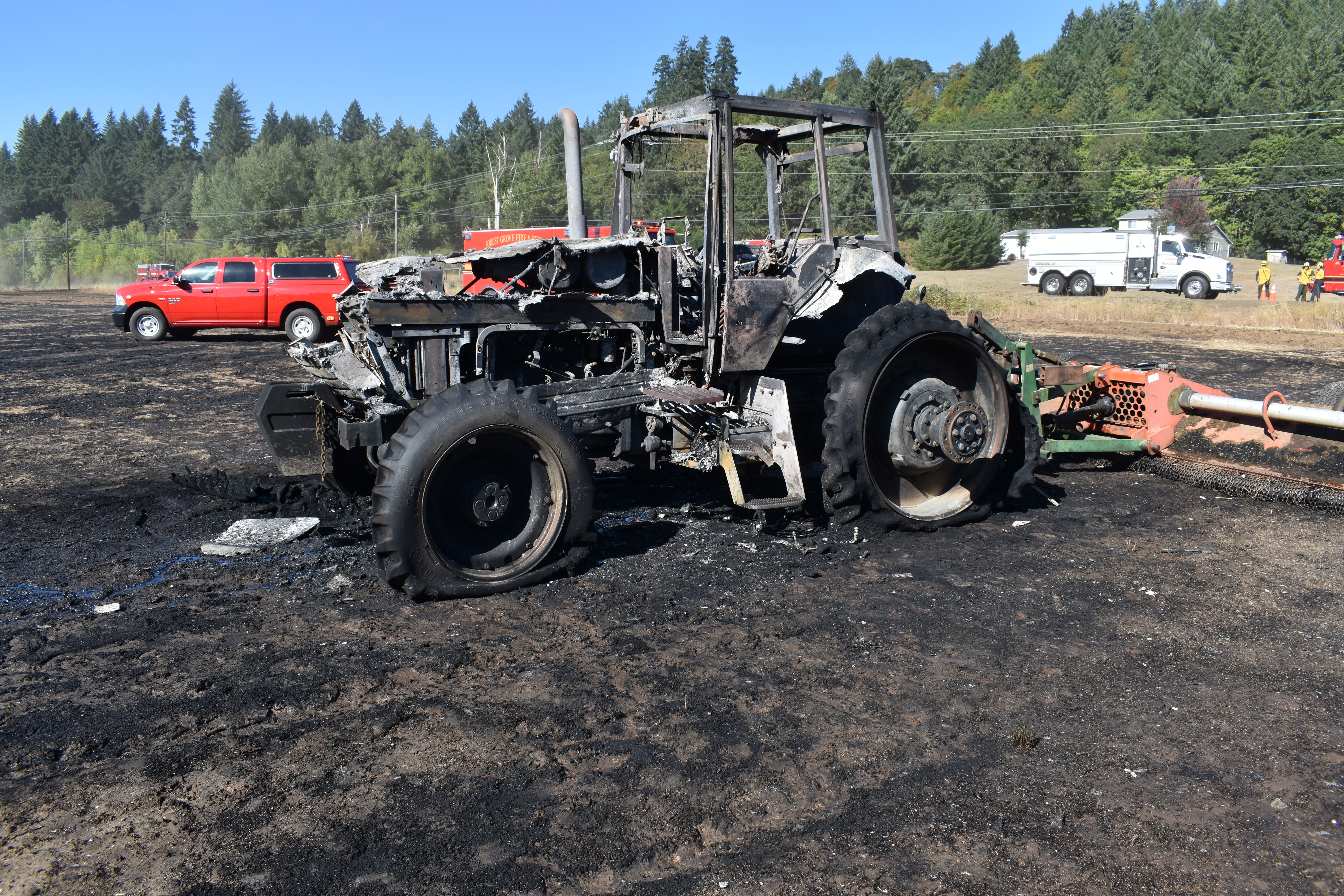A row of power lines had flames burn up to them, as a precaution we had Portland General Electric inspect the lines and found no damage. It is estimated the fire burned 7 acres of the field. Investigators spoke with the operator of the tractor who was using a flail mower implement behind the tractor to cut down the wheat stubble. While operating, they had alarms going off and found a fire in the back of the tractor near where the mower connects. They safely got out of the tractor and away from the flames, which quickly spread to the field. It is unknown at this time if the equipment had a malfunction or if a spark was created by the spinning mower. The tractor is a total lose.