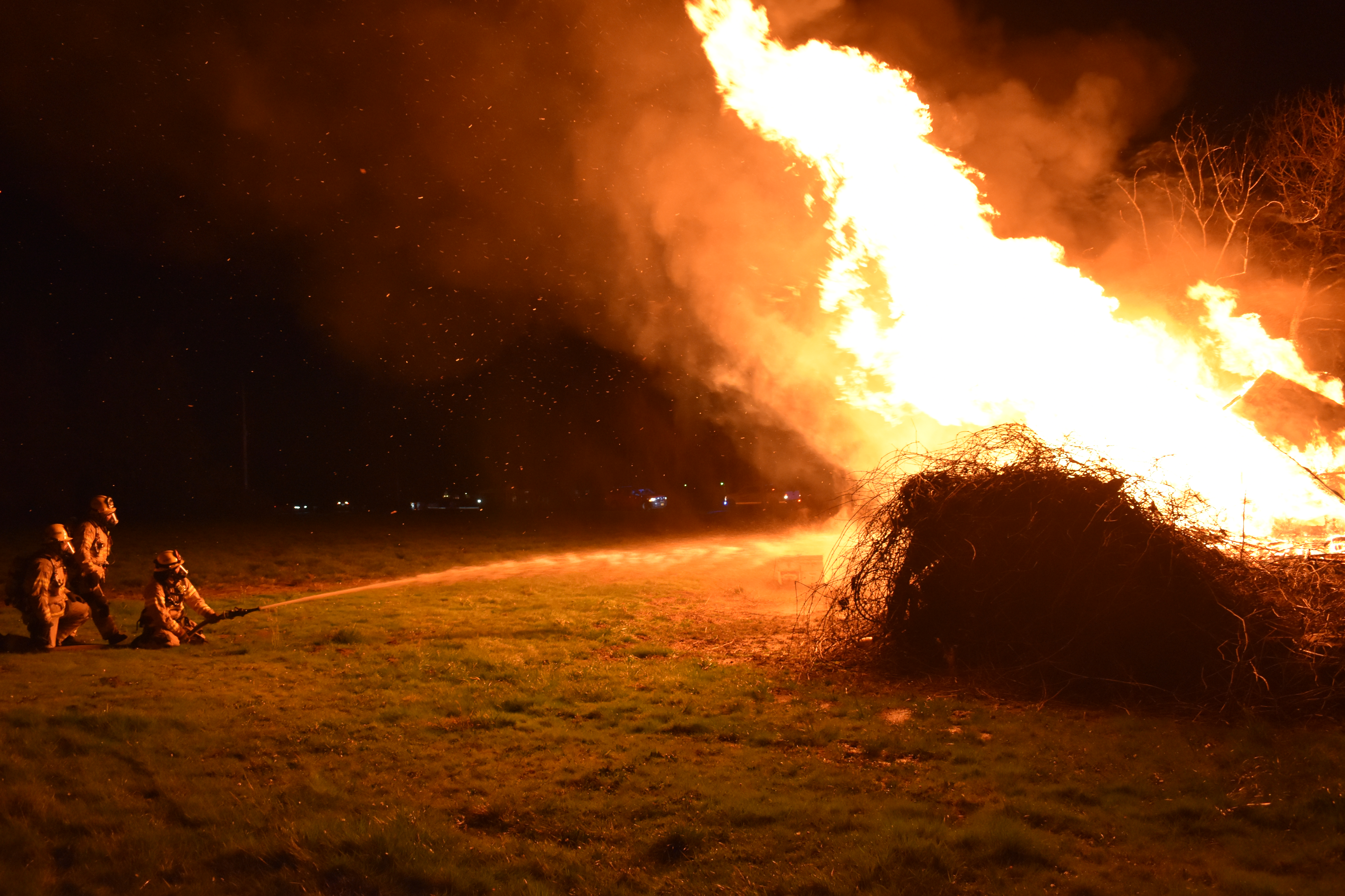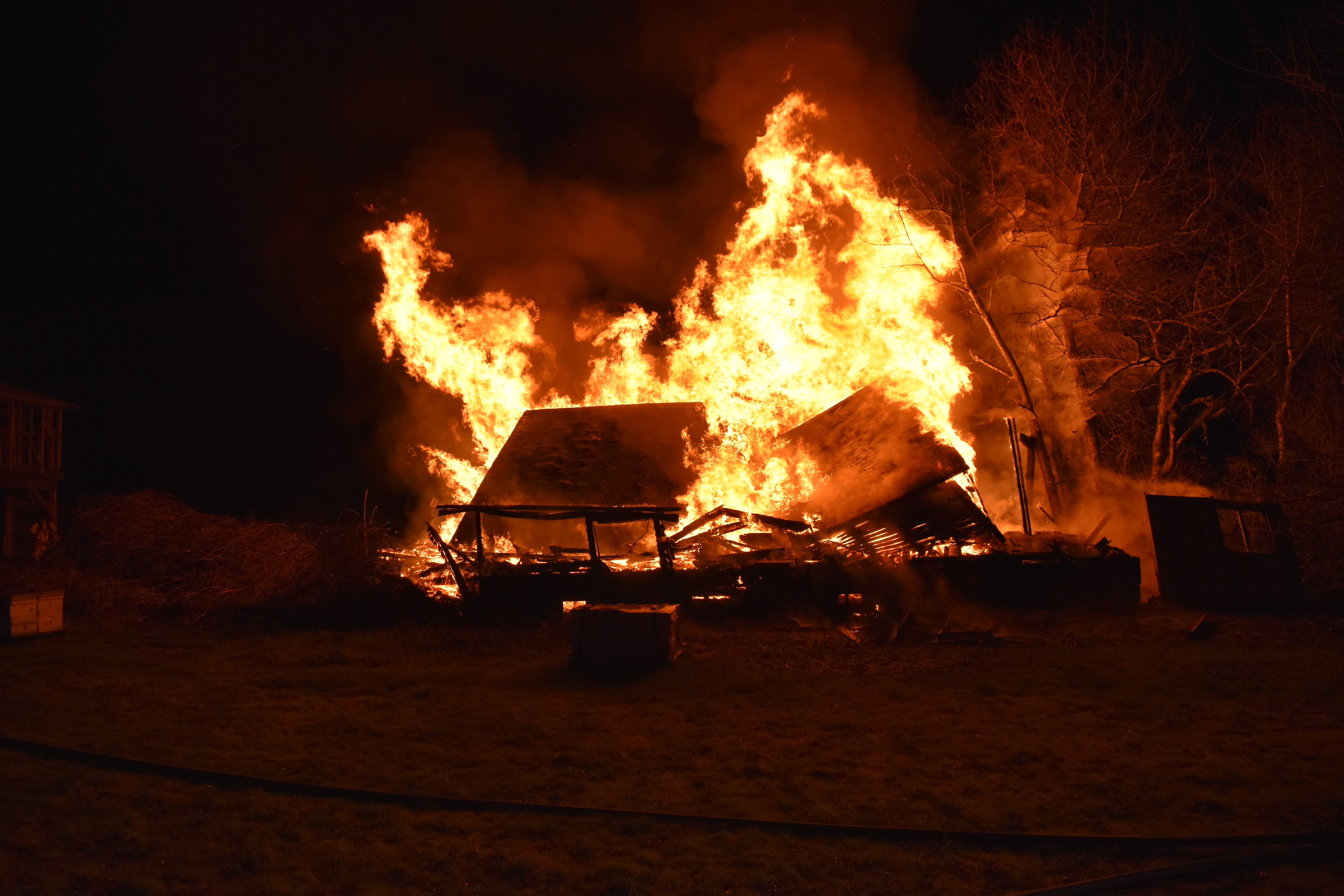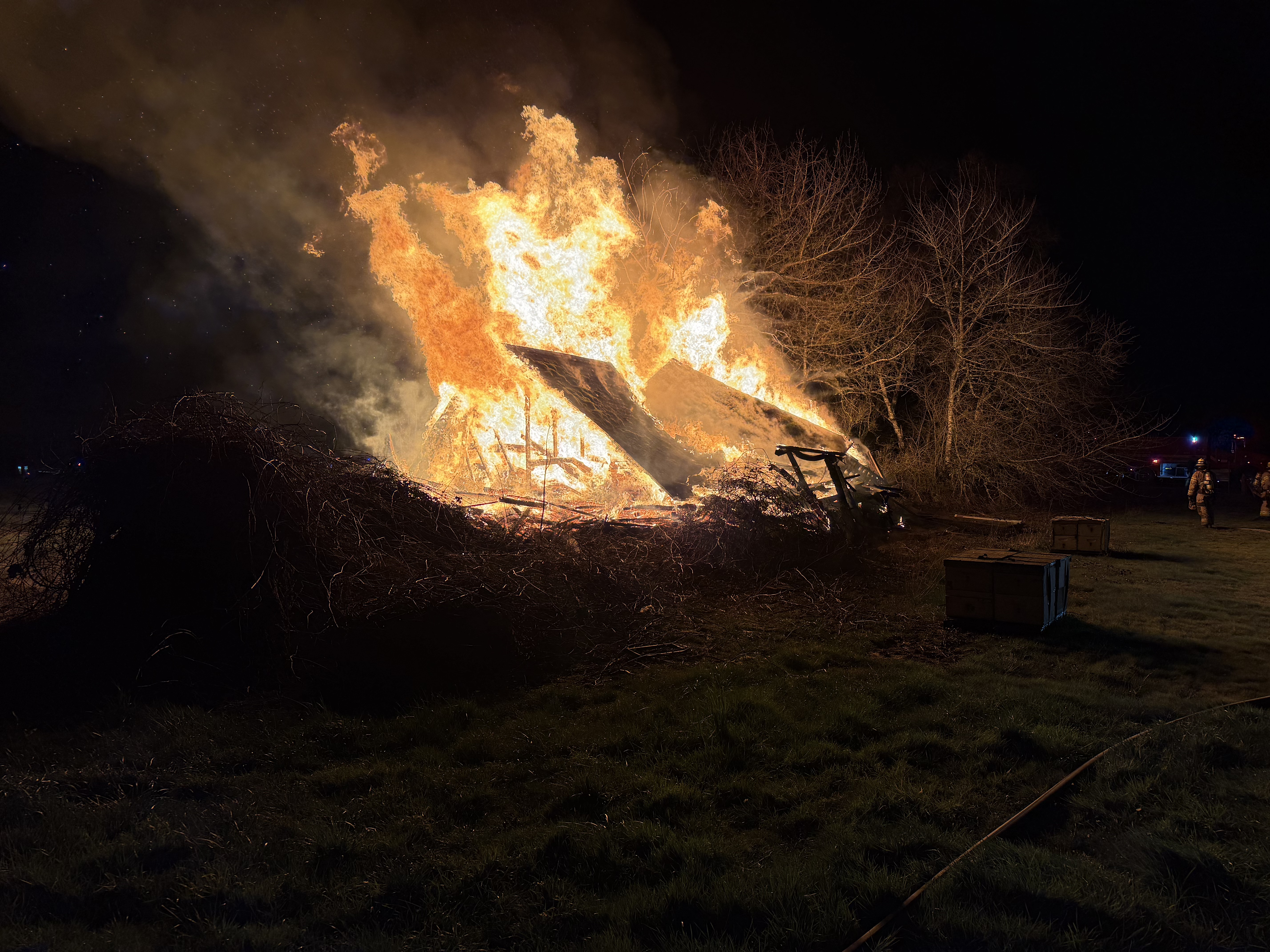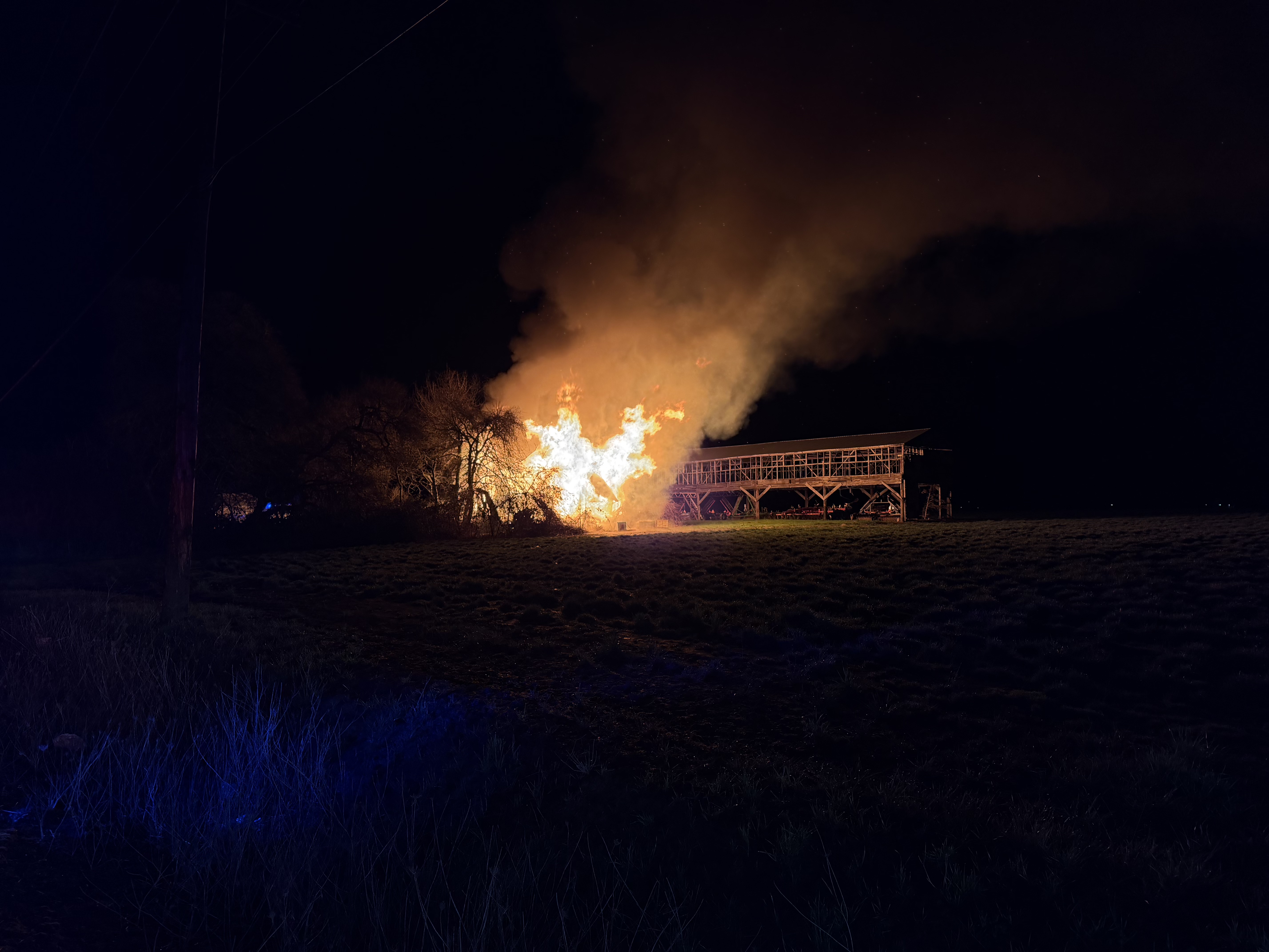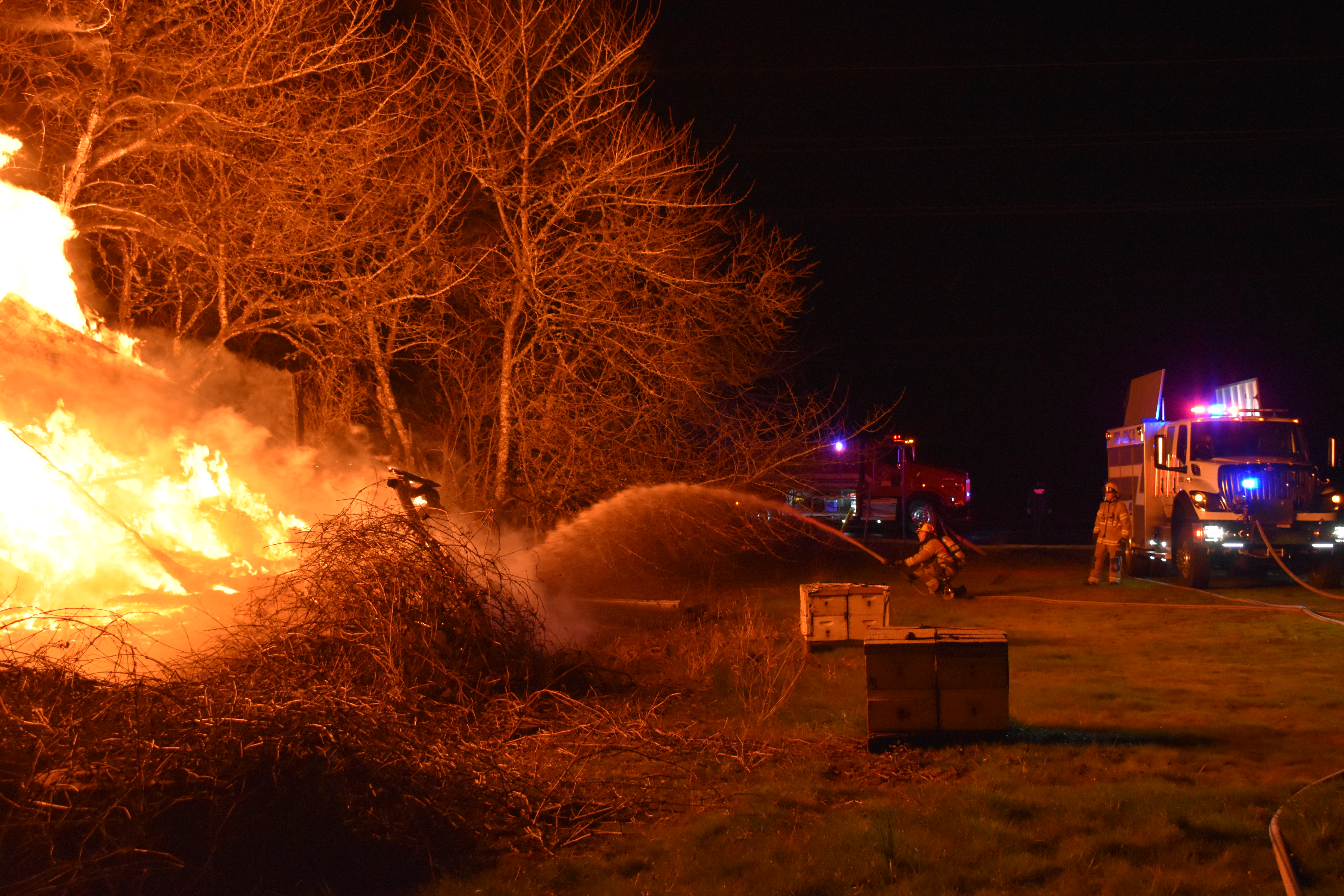 At 7:03pm on Tuesday February 24th, Forest Grove Firefighters were dispatched to a reported house fire on NW Highway 47, near the community of Greenville. Motorists on Highway 47 called in the fire stating a building was engulfed in flames. Minutes after being dispatched, the first fire units arrived on scene to find an abandoned house fully engulfed in flames and starting to collapse. Firefighters worked on extinguishing the fire while preventing embers from spreading to a nearby structure. Within minutes of firefighters arriving, the whole structure had collapsed onto itself. It took firefighters approximately 45 minutes to extinguish the majority of the fire with several hidden hot spots under the collapsed debris.