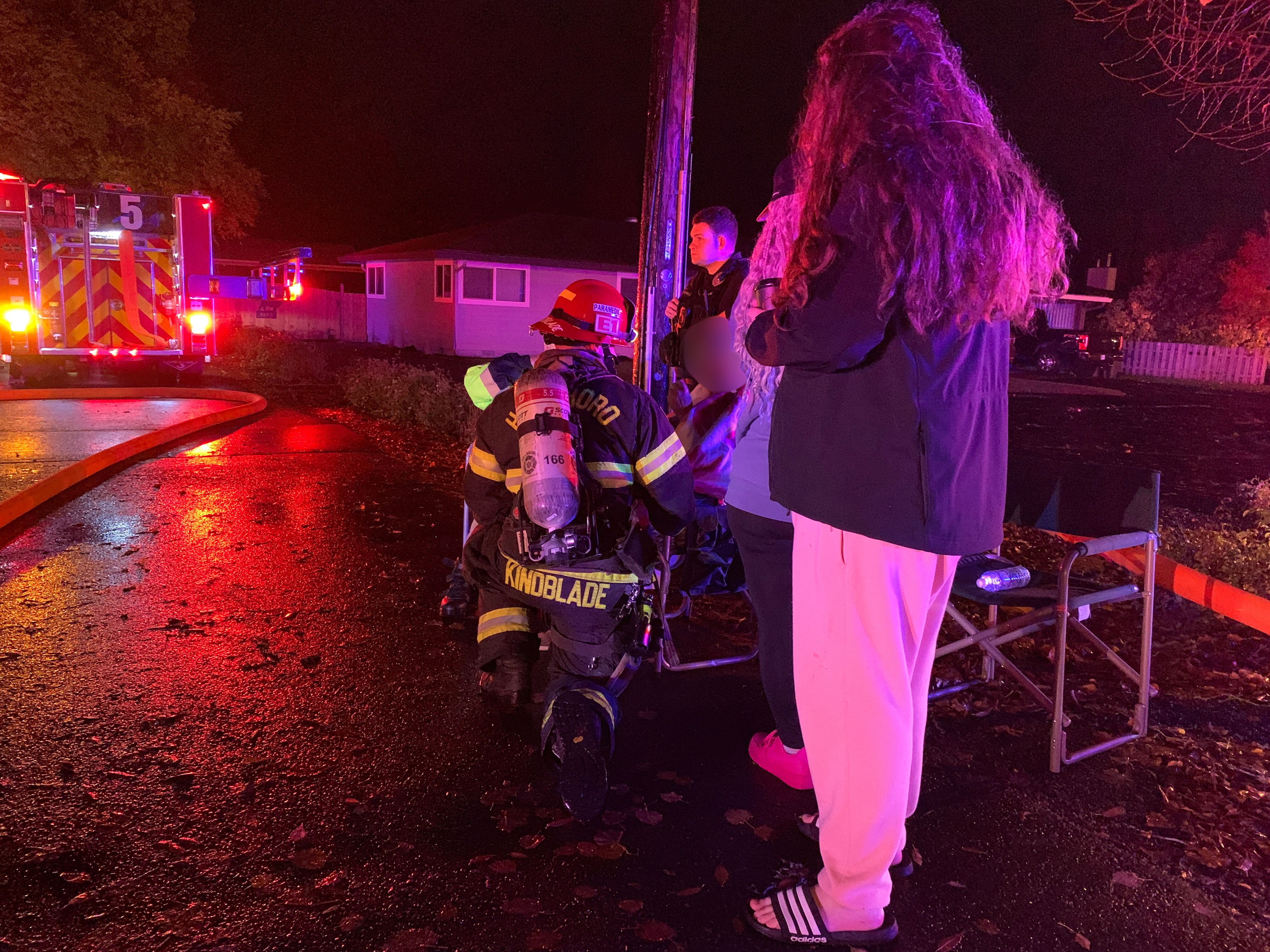 Firefighters searching the home confirmed that all residents and pets had been safely evacuated and that no one else was inside. No injuries were reported. In total, three adults and three dogs were safely accounted for. A public safety chaplain responded to the incident to provide comfort and assistance to the residents. He learned that one of the residents was scheduled for a medical procedure this morning and alerted the incident commander and fire crews. The resident was only able to escape wearing sleepwear and needed clothing and medications pertinent to their health. Firefighters re-entered the home to help the resident retrieve clothing that was safe to wear. They also located and retrieved the necessary medications. Further, a Hillsboro police officer assisted at the incident. Initially, the officer provided incident safety by slowing and diverting traffic as needed around emergency responders and apparatus staged along NE Evergreen Road. He then assisted the residents by temporarily sheltering their dogs in his patrol vehicle until they could be safely transferred to a family member’s vehicle and care. Three adult residents and three dogs were displaced because of the fire. Family members arrived at the scene to provide additional support and care.