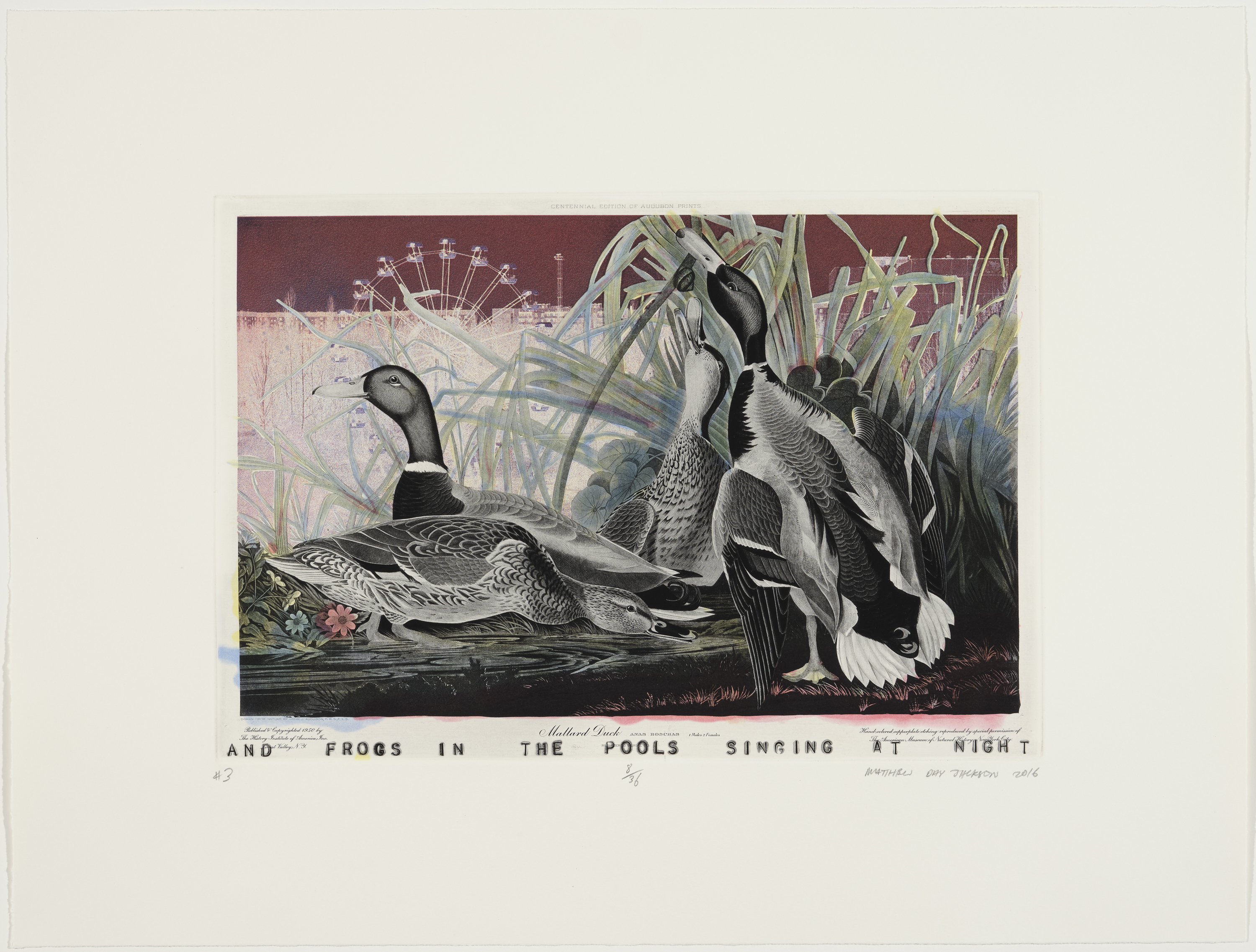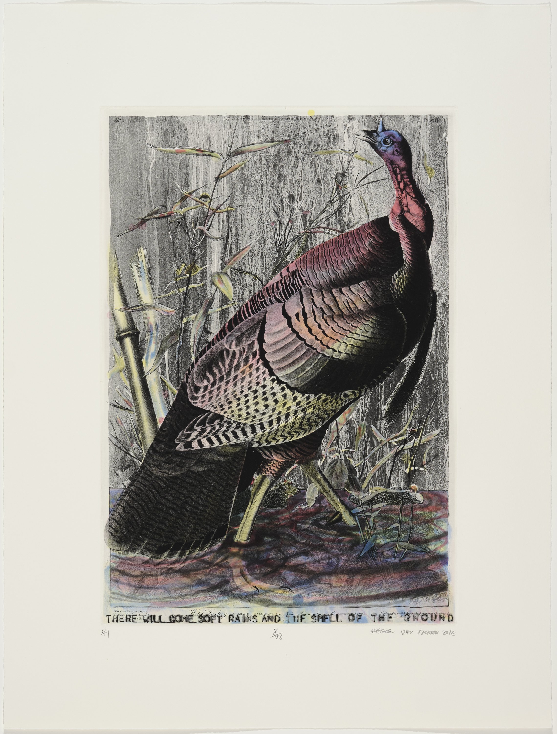 Twelve pieces by Jackson will hang in Near, Far, Gone, titled “There Will Come Soft Rains #1-#12.” In the creation of this series, he transformed 1930s copper plates [GU1] etched with Audubon's birds, adding vibrant colors and layers of images. The portfolio's title is drawn from Sara Teasdale's poem "There Will Come Soft Rains," evoking nature's resurgence after devastation. Jackson incorporated one stanza of the poem onto each plate. Notably, several birds depicted in the portfolio are now extinct or critically endangered, like the carrier pigeon and the ivory-billed woodpecker, due to human activities.