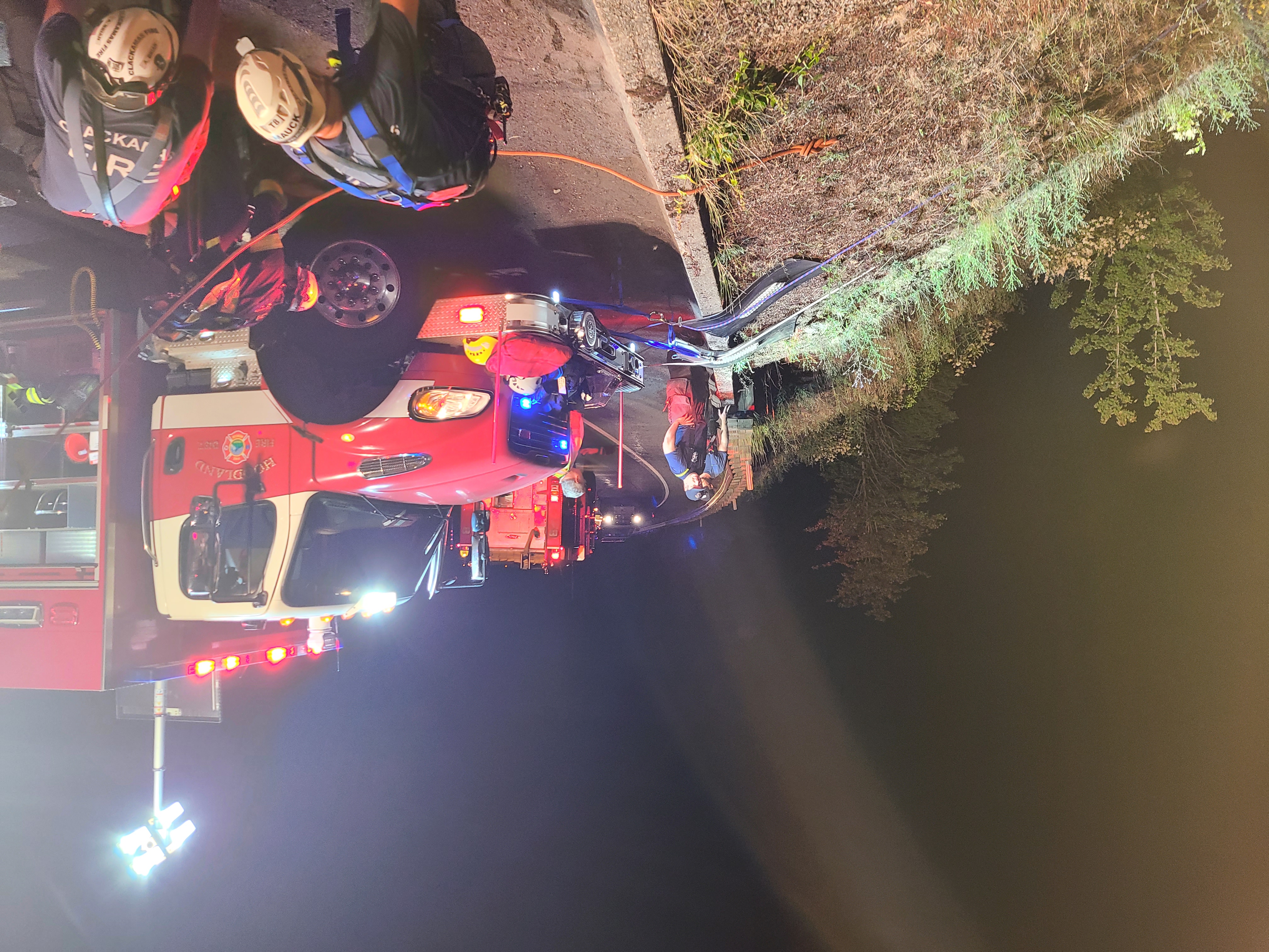 Government Camp, Ore. — Shortly after 11:00 p.m. on Wednesday July 12, Hoodland Fire District responded to a technical rescue to a vehicle that went over a guardrail and down a steep embankment on Highway 26 near mile post 50. Hoodland firefighters were assisted by Clackamas Fire District and rescued two people who were in the pickup truck. One occupant was able to get out of the vehicle on their own and the other was entrapped inside the vehicle. Firefighters sent personnel over the embankment using rope systems and were able to get both people up to the highway in just under 5 hours. Highway 26 was closed during that time and used to land two separate Lifeflight helicopters.