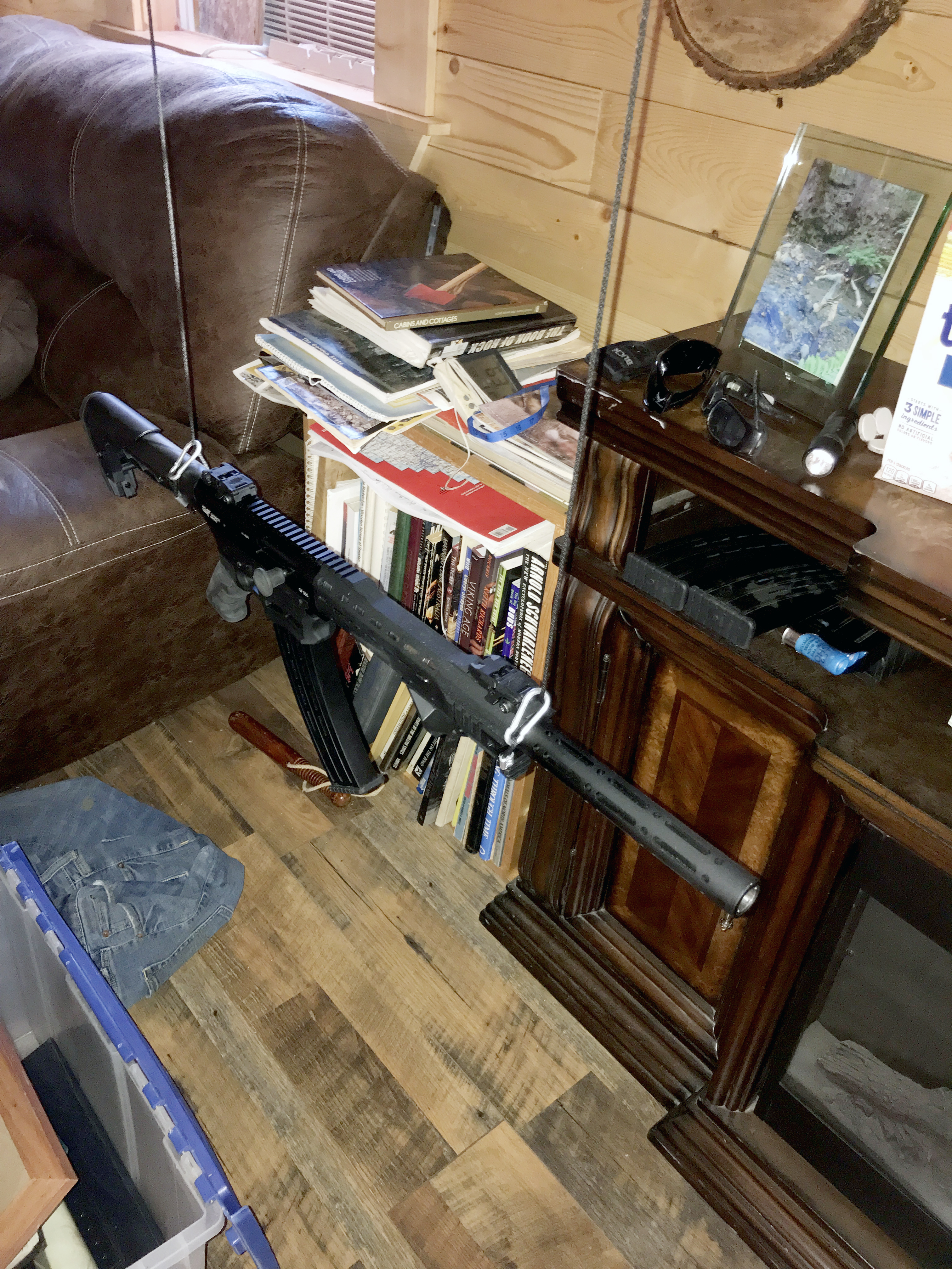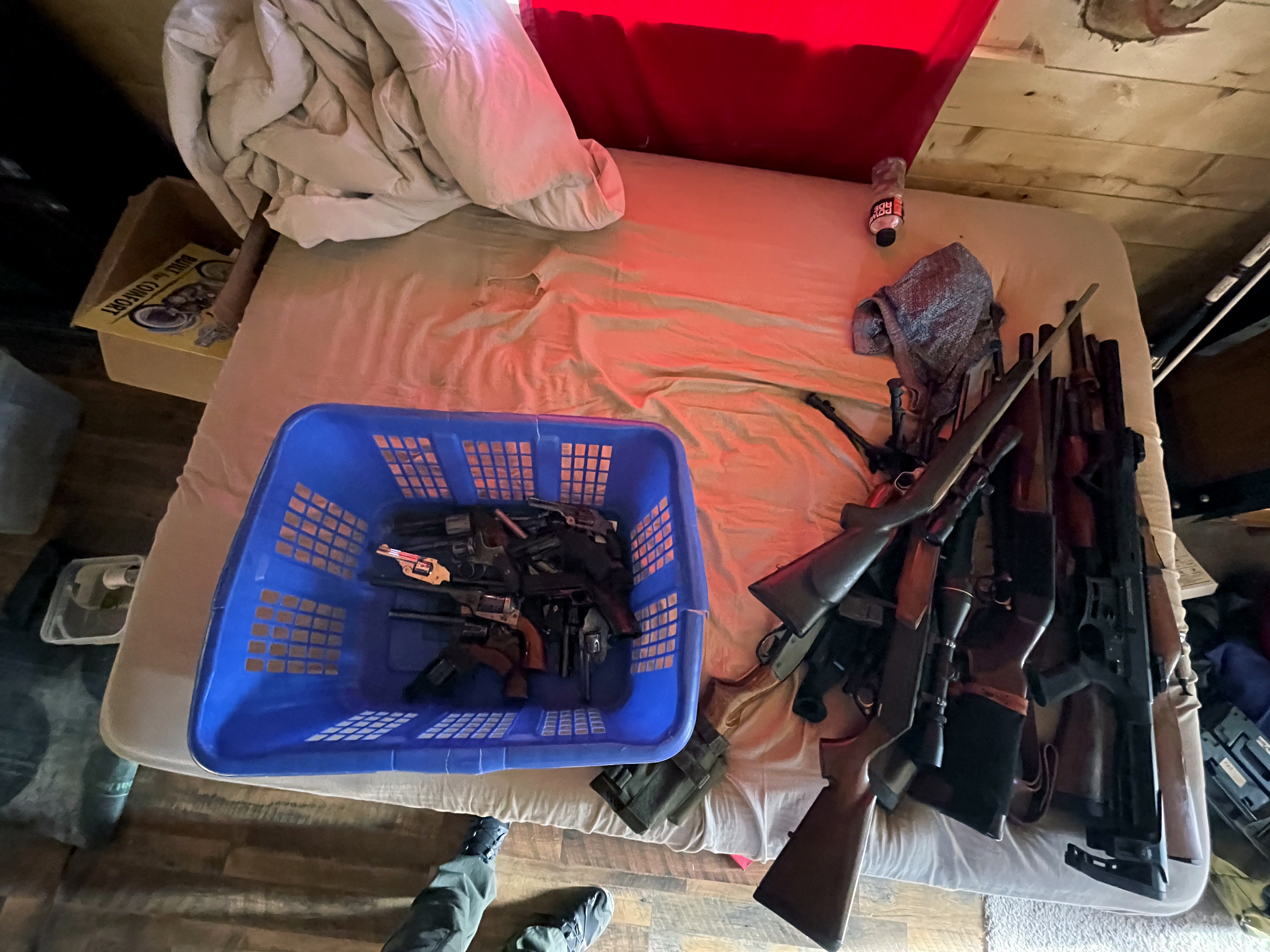 The suspect, Scott David Binion, 58, of Eagle Point, was not on the property at the time the warrant was served but was later contacted and charged with felony fourth-degree assault domestic violence, harassment, unlawful possession of a machine gun, unlawful possession of marijuana, and unlawful manufacturing of marijuana. On scene deputies found and seized 40 firearms, many of which were loaded and staged for use, including a shotgun suspended from the ceiling and pointed towards the door.