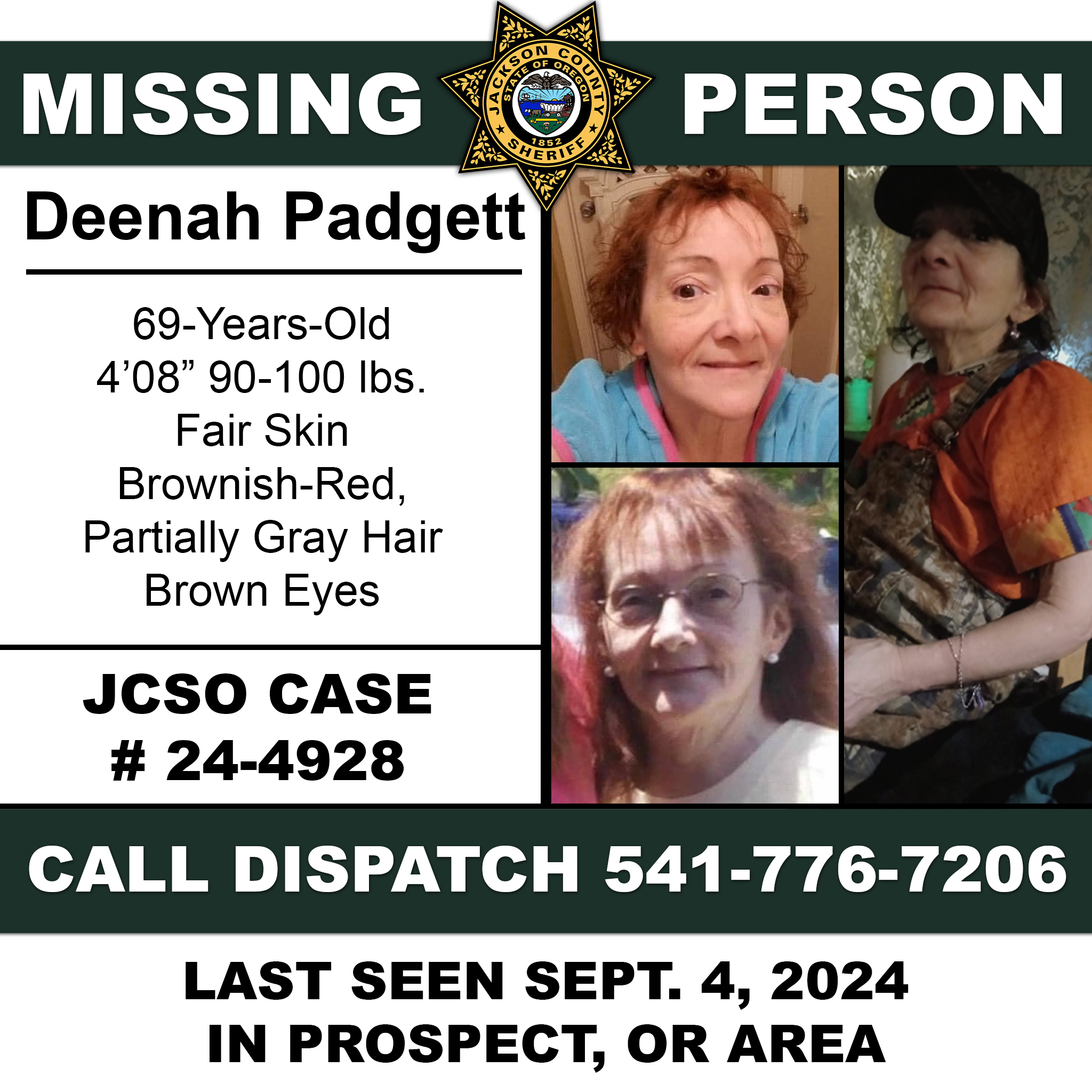 PROSPECT, Ore. – Jackson County Sheriff’s Office (JCSO) detectives and Search and Rescue (SAR) personnel continue to search for a woman missing out of Prospect, Ore. since September 2024. Deenah Padgett, 69, was reported missing on Sunday, September 8, 2024. She was last seen camping in the Prospect area on September 4, 2024. She is described as a white woman with brownish-red, partially gray hair, standing 4’8” tall and weighing 90-100 lbs.