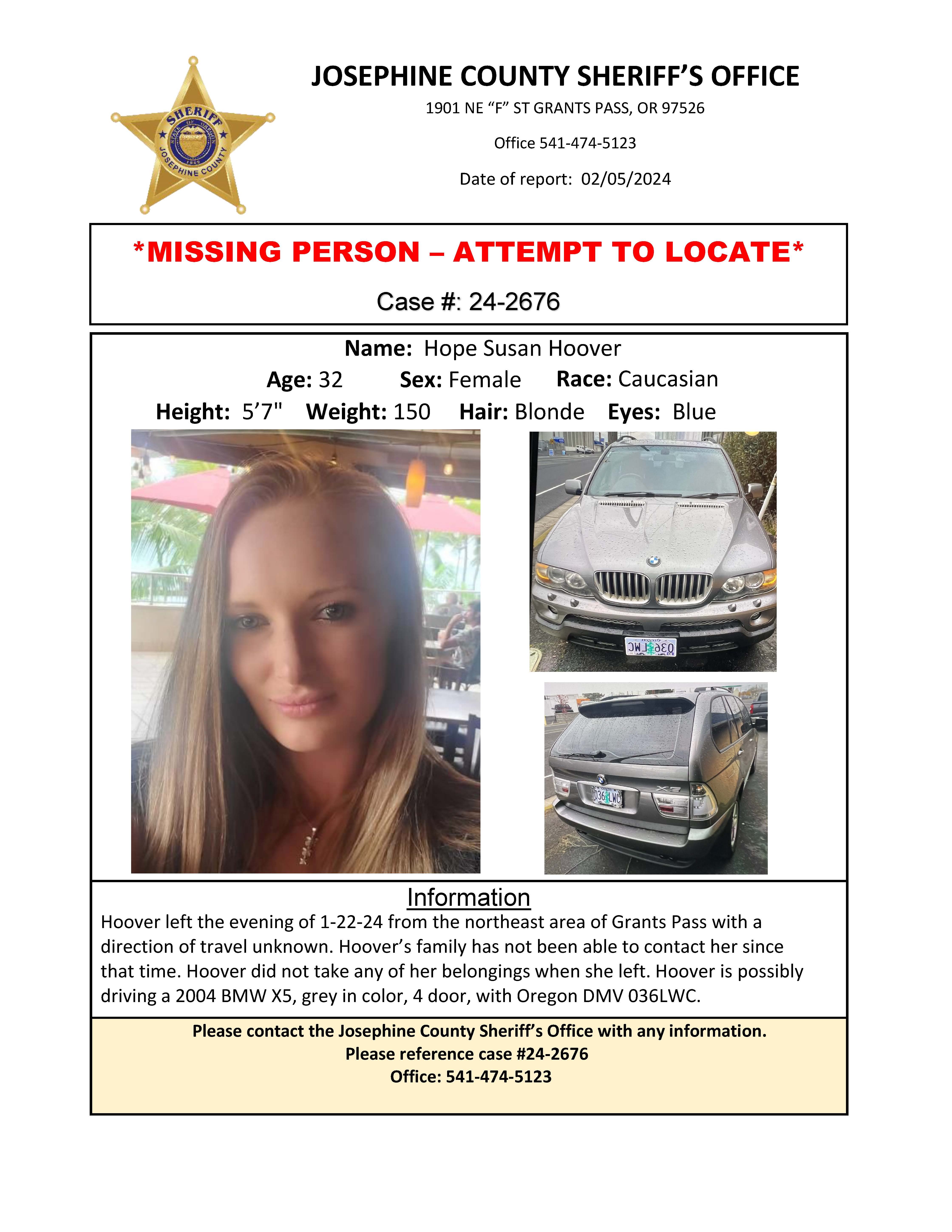 INFORMATION: Hoover left the evening of 1-22-24 from the northeast area of Grants Pass with a direction of travel unknown. Hoover’s family has not been able to contact her since that time. Hoover did not take any of her belongings when she left. Hoover is possibly driving a 2004 BMW X5, grey in color, 4 door, with Oregon DMV 036LWC.