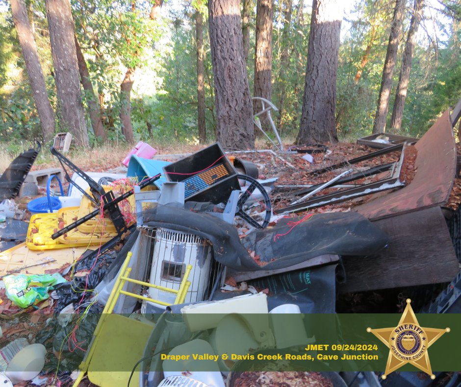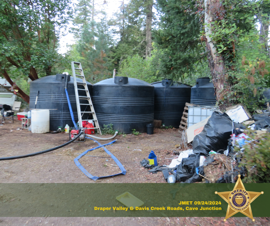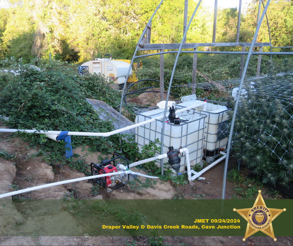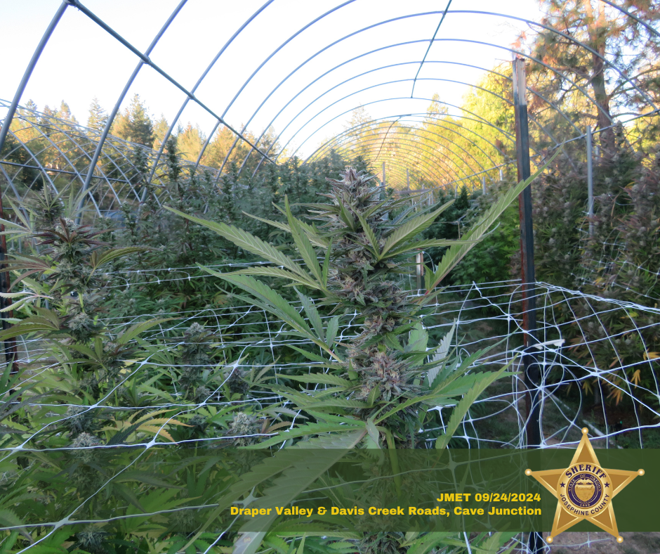 DETAILS: On September 24, 2024, the Josephine Marijuana Enforcement Team (JMET) executed two search warrants at two conjoined properties in the 500 block of Davis Creek Road and the 200 Block of Draper Valley Road, Selma, regarding illegal marijuana grow sites. The search warrants were executed with the assistance of Josephine County Public Health & Building Safety.