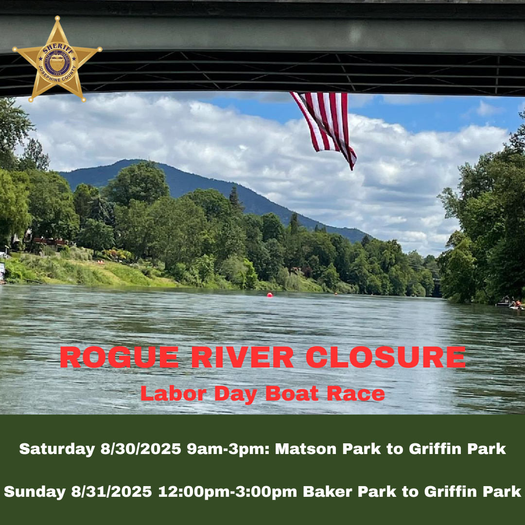 Please Contact the Josephine County Sheriff’s Office (541) 474-5123. If you have any questions regarding the river closures.