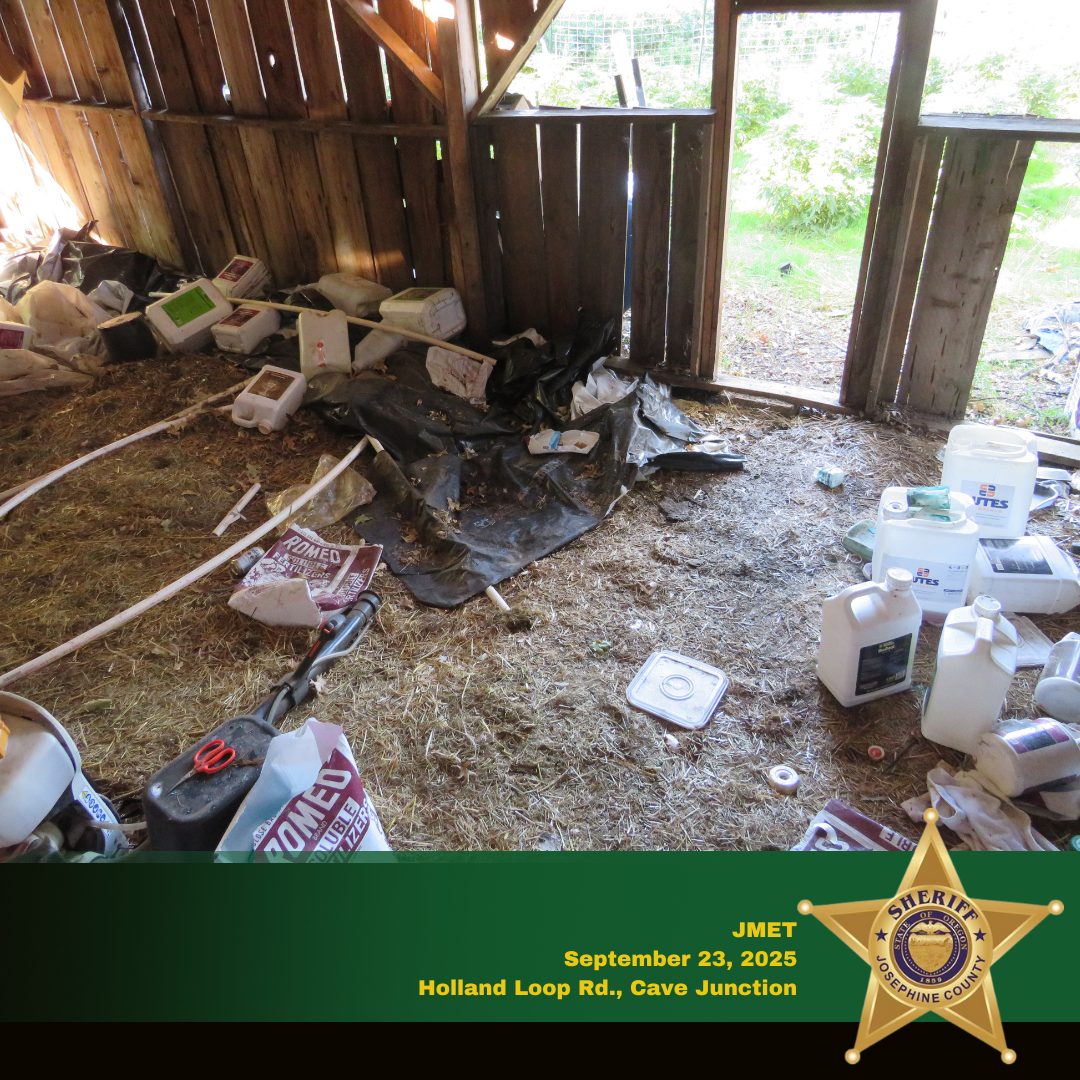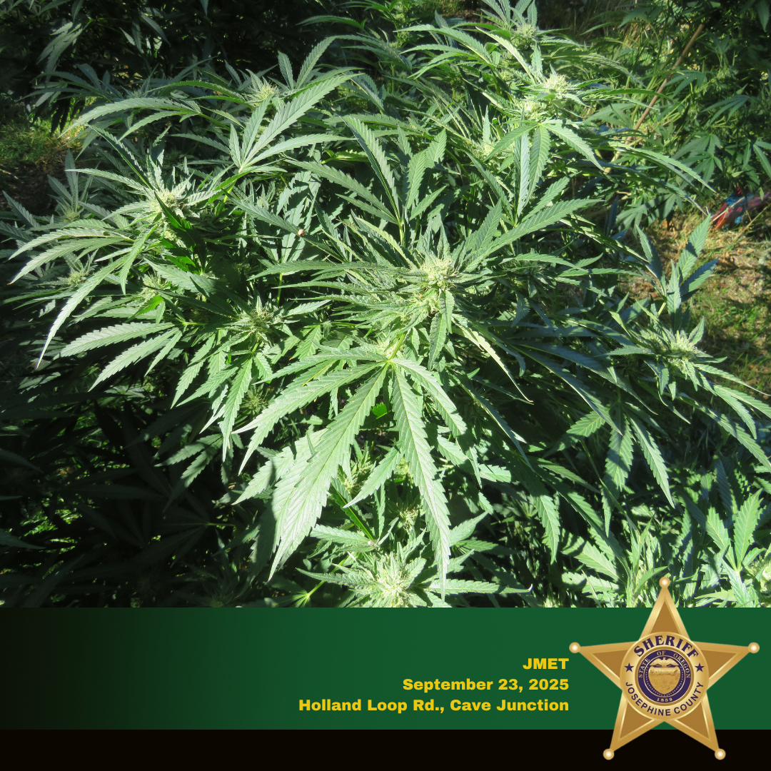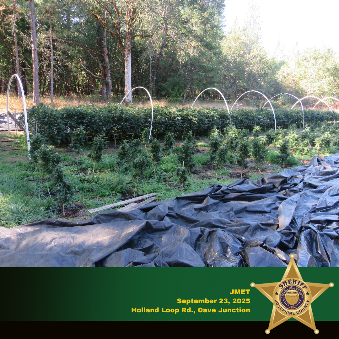 DETAILS: On September 23, 2025, the Josephine Marijuana Enforcement Team (JMET) executed a search warrant in the 5000 block of Holland Loop Road, Cave Junction, regarding an illegal marijuana grow site. The search warrant was executed with the assistance of the United States Marshals Service (USMS) and Internal Revenue Service (IRS).