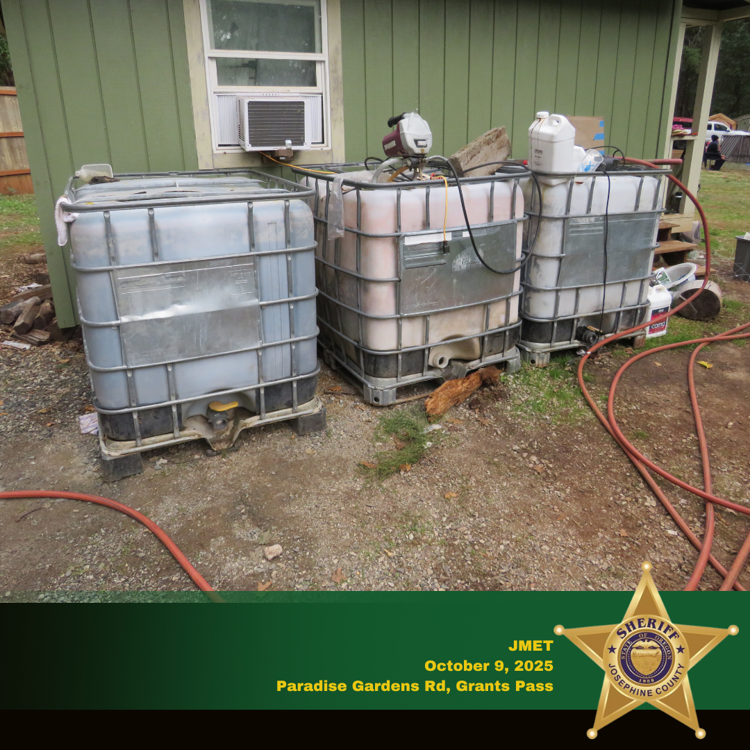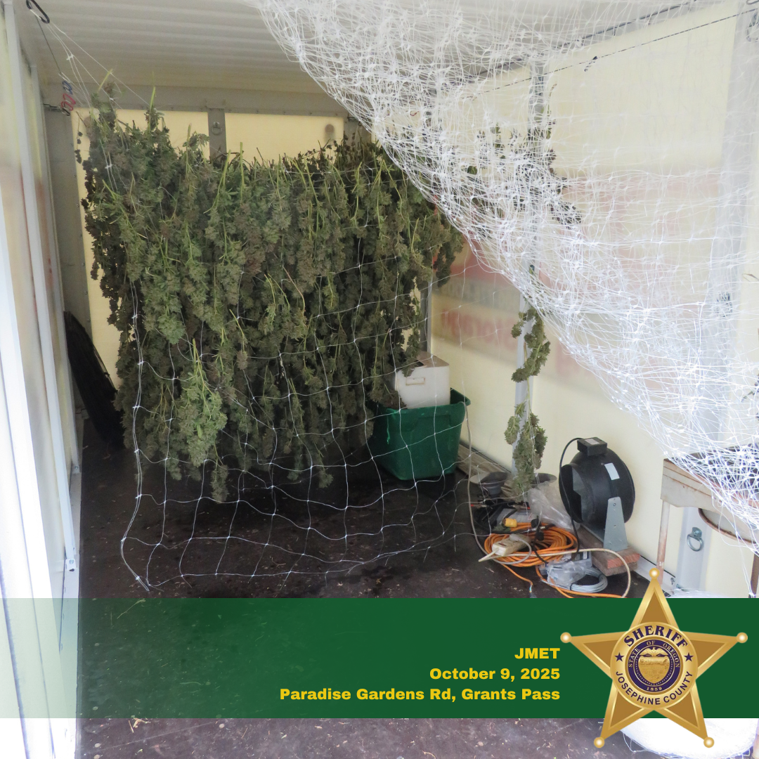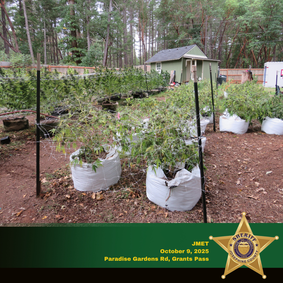 DETAILS: On October 9, 2025, the Josephine Marijuana Enforcement Team (JMET) executed a search warrant in the 800 block of Paradise Gardens Rd, Grants Pass, regarding an illegal marijuana grow site.