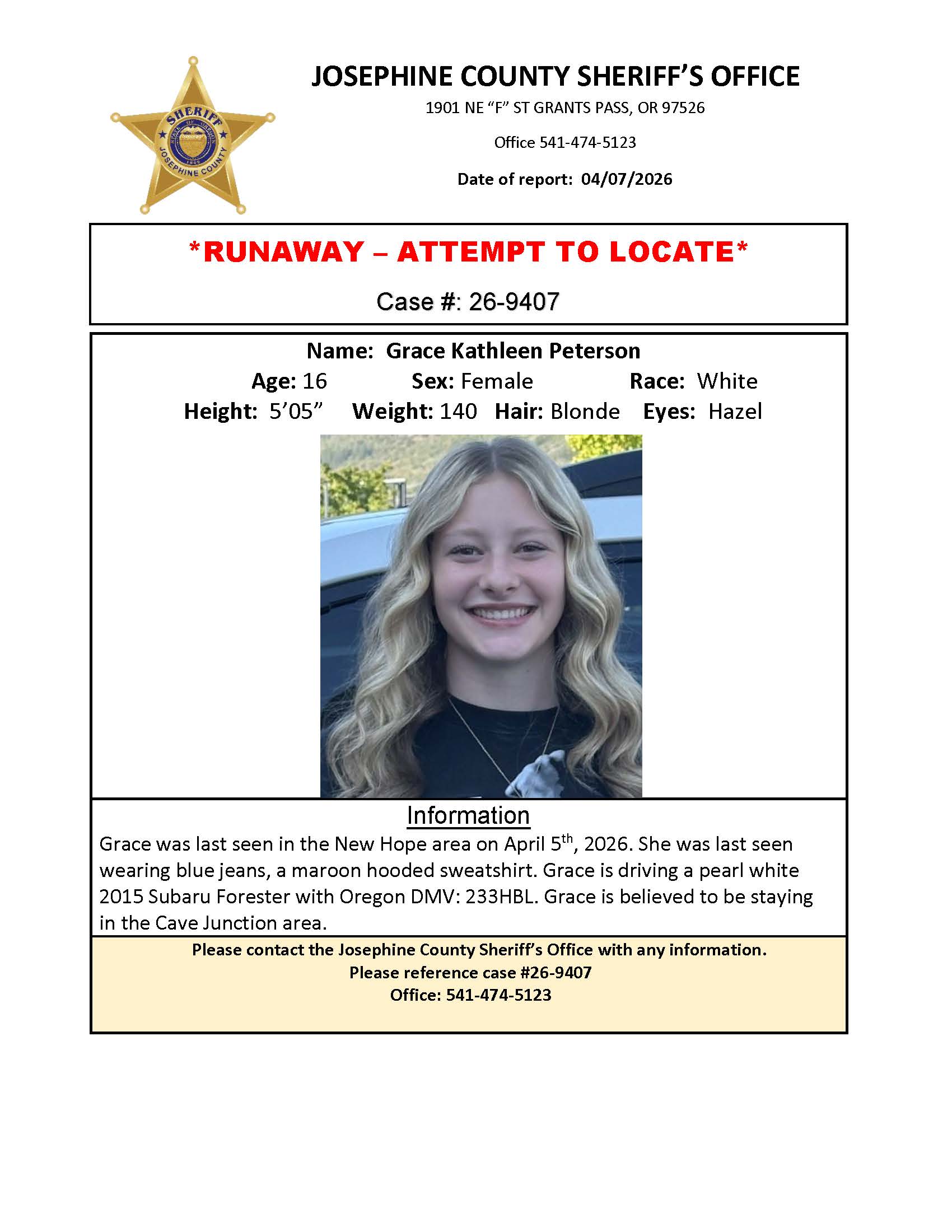 Please call the Josephine County Sheriff's Office with any information. 541-474-5123