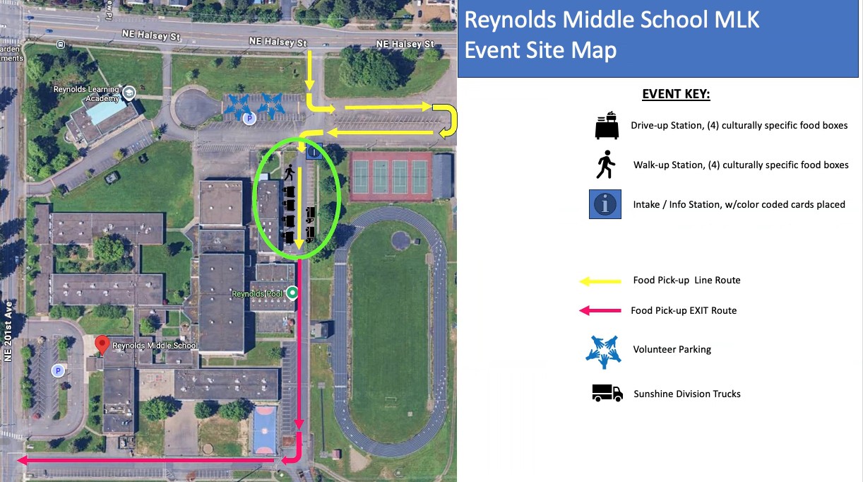 Families and individuals in need are invited to come to the Reynolds Middle School campus by the Reynolds Pool Building (20218 N.E. Halsey St., Fairview, Ore.) from 10 a.m. to 2 p.m. on Monday, Jan. 19 to receive a free food box; no questions asked. The home deliveries and bulk food deliveries have already been claimed.