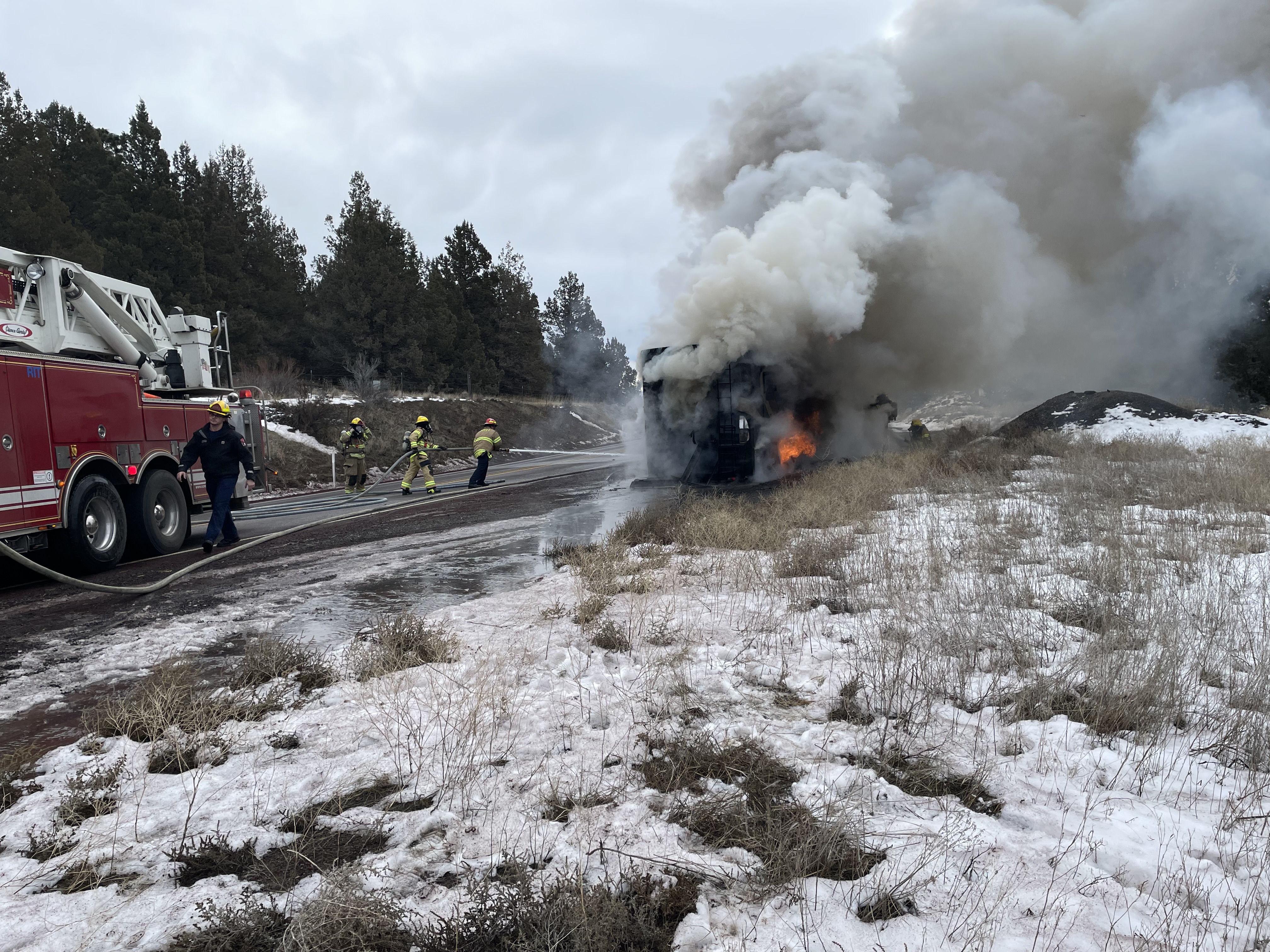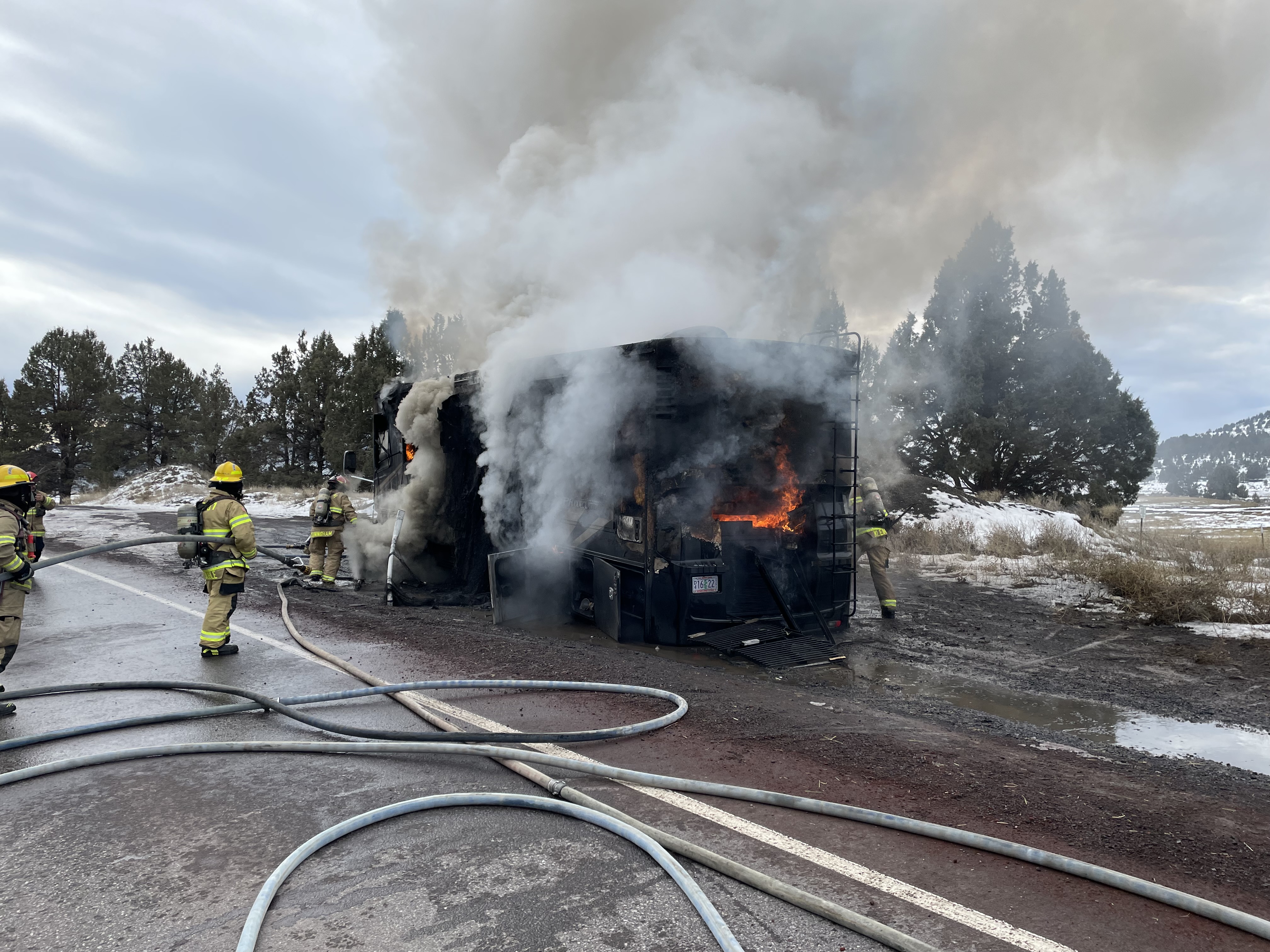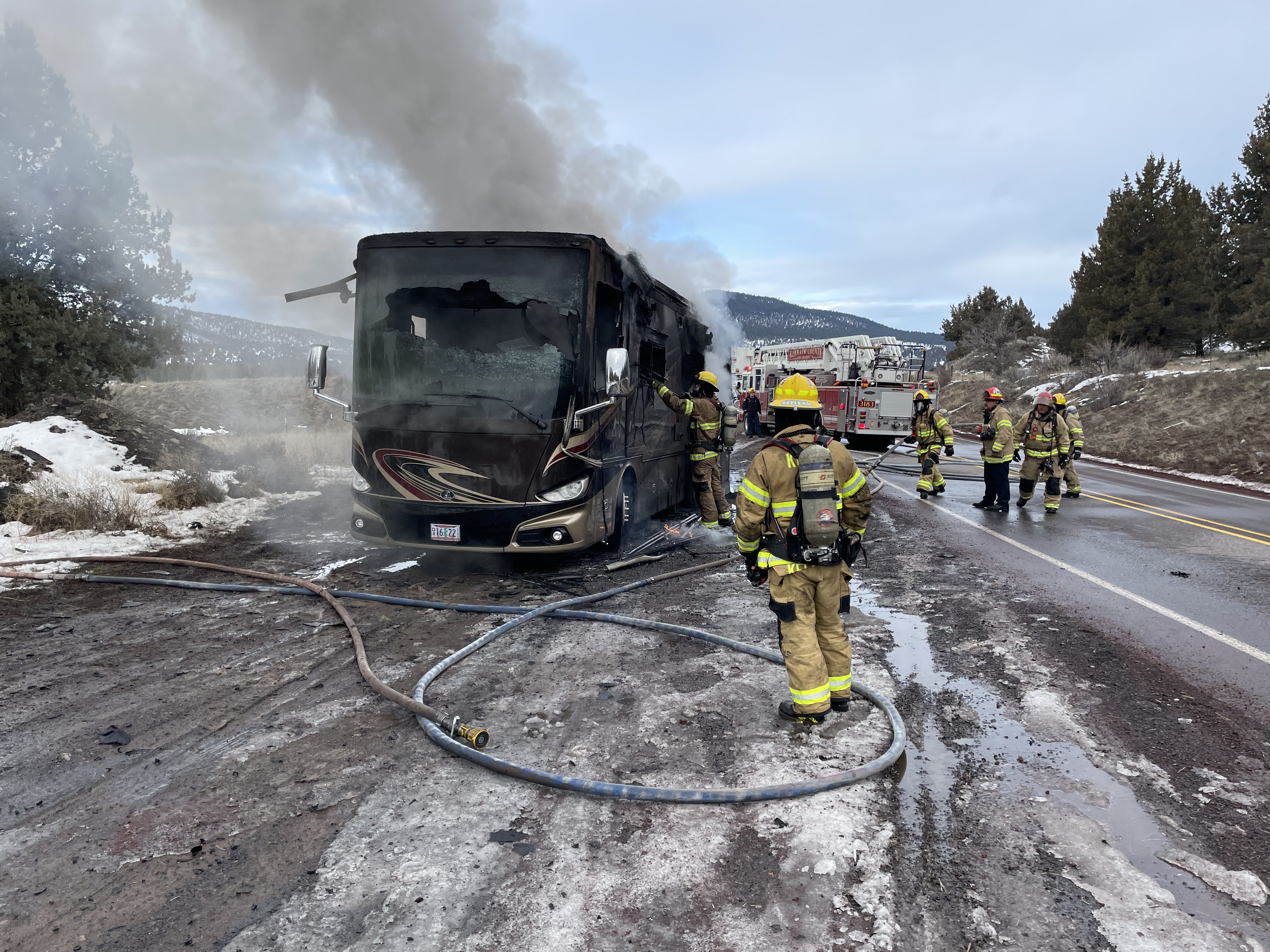 A large RV fire closes Hwy 140 east at mile post 12 in Klamath County for several hours. Klamath County Fire District 1, along with Bonanza Fire Department and Kingsley Field Fire Department battled a fire in a large RV approximately 10 Miles east of Klamath Falls. The RV was in transit to Klamath Falls, when smoke and flames where seen coming out of the back tire area. The driver pulled over and attempted to extinguish the fire, but was unable too. The fire loss is estimated to be over $250,000. No injuries were reported. The cause is under investigation.
