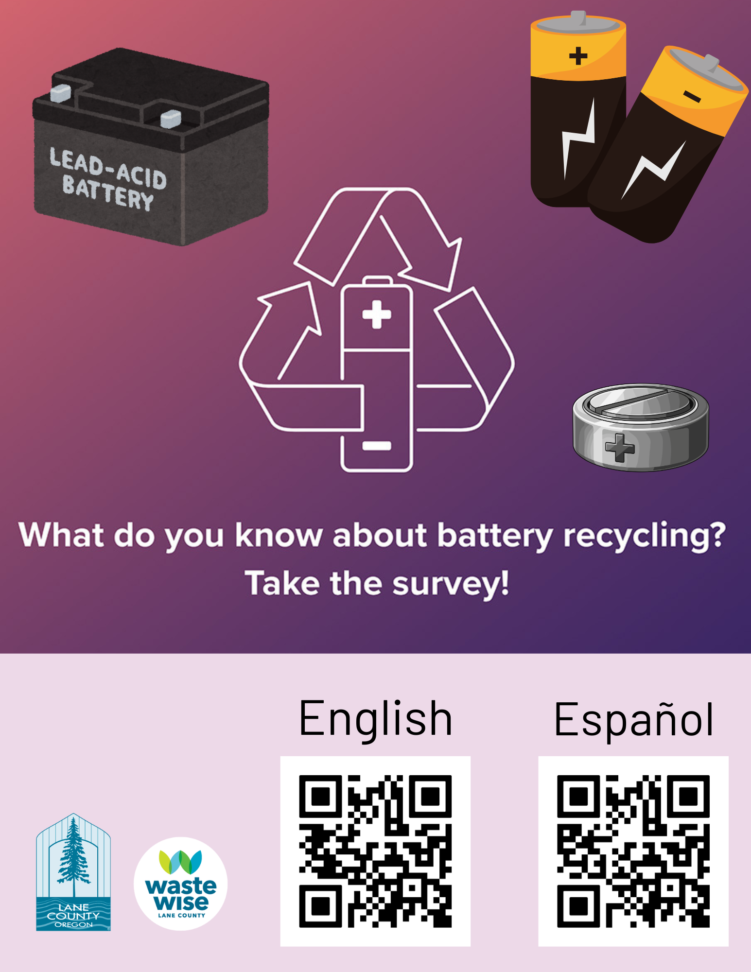 Waste Wise Lane County—a part of the Lane County Waste Management Division—is asking residents to take a short community survey to help prevent dangerous battery fires and improve battery recycling, disposal, and storage practices.