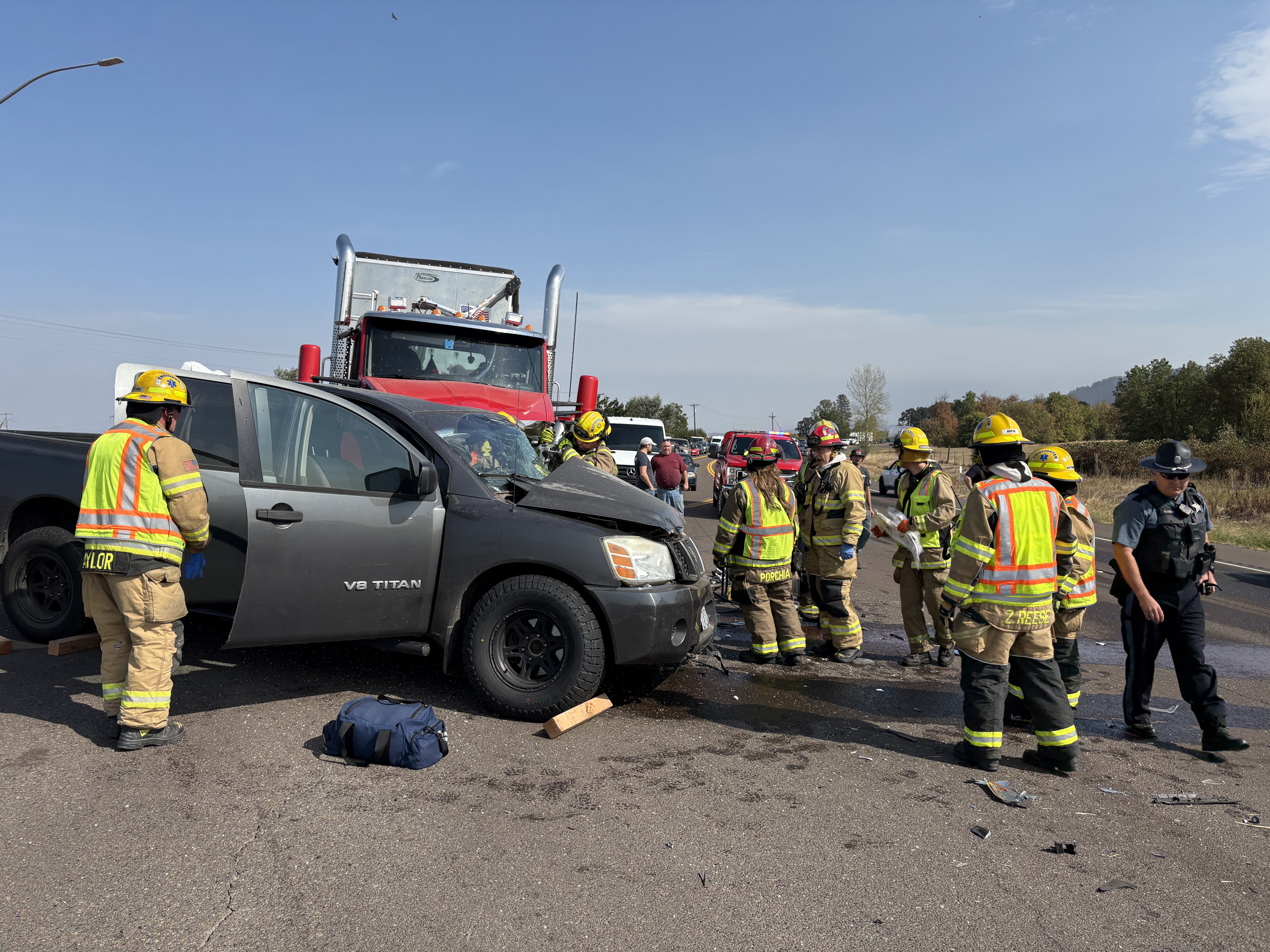 Today at approximately 3:45pm, Tangent Rural Fire District was dispatched to Highway 34 and Goltra for a report of a semi-truck that T-boned a passenger vehicle with one person trapped inside.