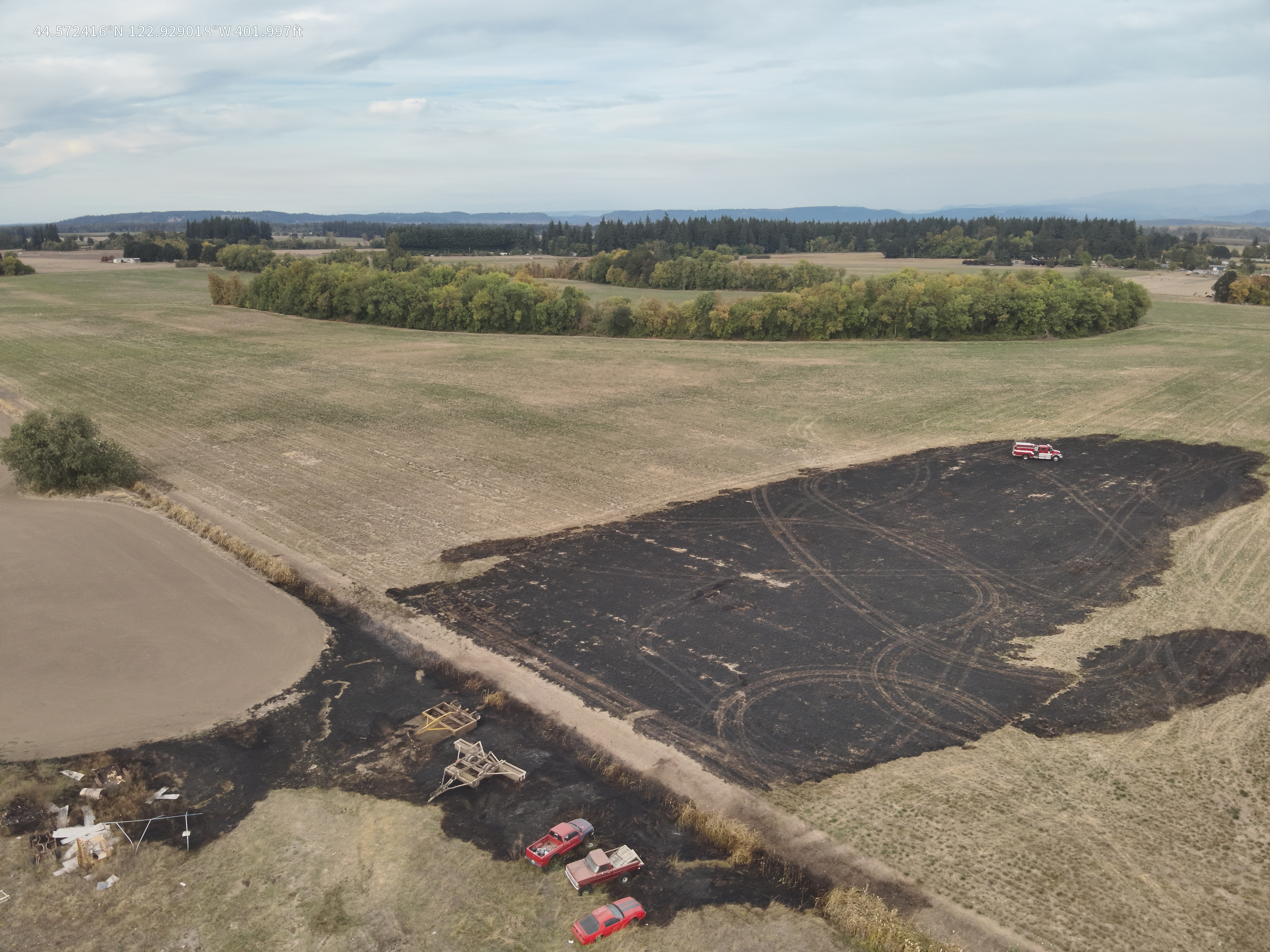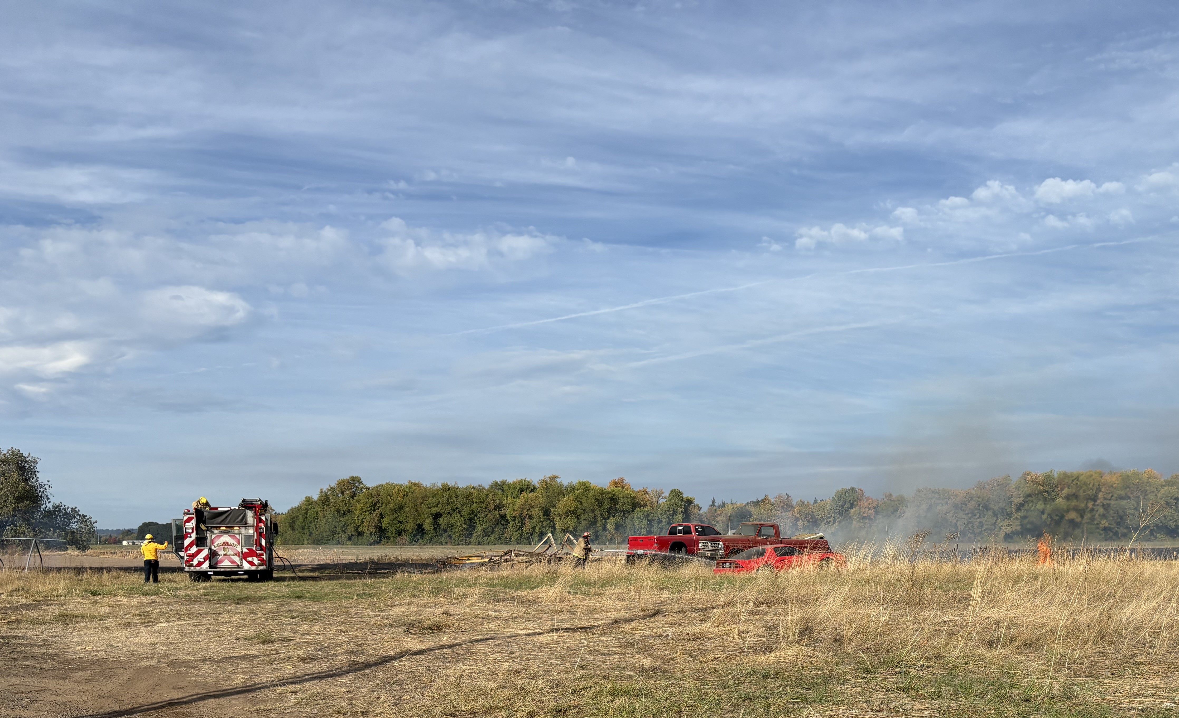 Engine 31 quickly attacked the flames near the cars, preventing damage, while also stopping the fire from spreading toward an abandoned barn. Brush 34 and Engine 34 gained access to the field and, working with a farmer’s water truck, knocked down the fire and established control lines. Crews put in a thick wet line around the burn area to secure the perimeter. Engine 31 also secured areas near a burn pile and assisted with water supply.