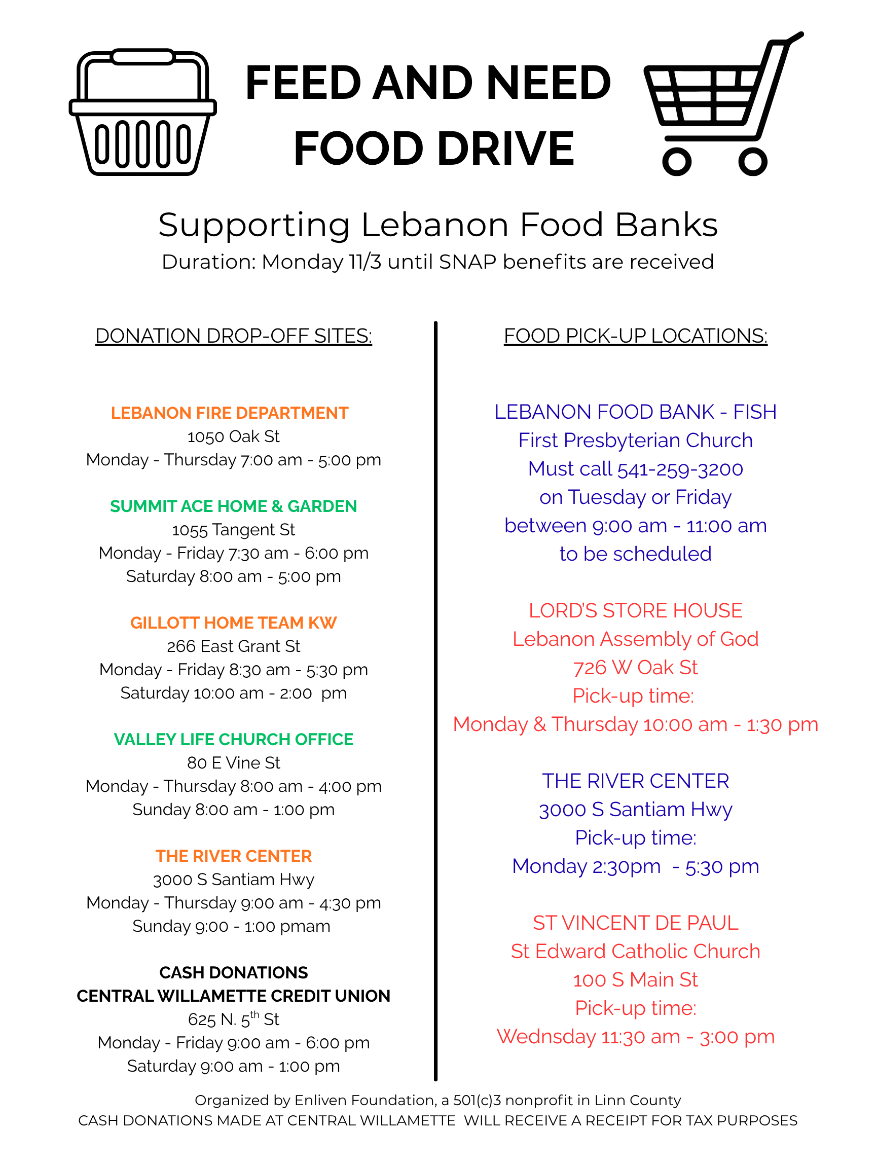 The Lebanon Fire District is proud to partner with local organizations to support a community-wide food drive benefiting Lebanon’s food banks. The effort—organized by the Enliven Foundation—aims to help families affected by the temporary suspension of SNAP benefits during the ongoing government shutdown.