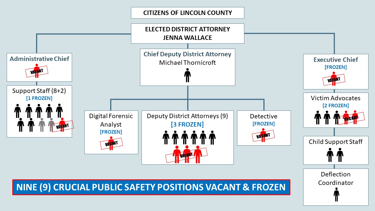 Currently, the District Attorney’s Office has 10 vacant positions with 9 of those positions having been frozen by Commissioner Hall, despite repeated requests for 5 exceptions specifically based on community safety concerns and over-all public necessity. Commissioner Hall and Commissioner Walter Chuck have denied all five of these requests. These requests include exceptions for three (3) deputy district attorney positions, the detective position, as well the Executive Chief, an upper management position responsible for not only supervising crime victim advocates and child support enforcement but is fundamental in coordinating Lincoln County’s statutorily mandated multidisciplinary teams to ensure appropriate investigation and swift prosecution in child abuse, elder abuse, sexual assault, and domestic violence cases.