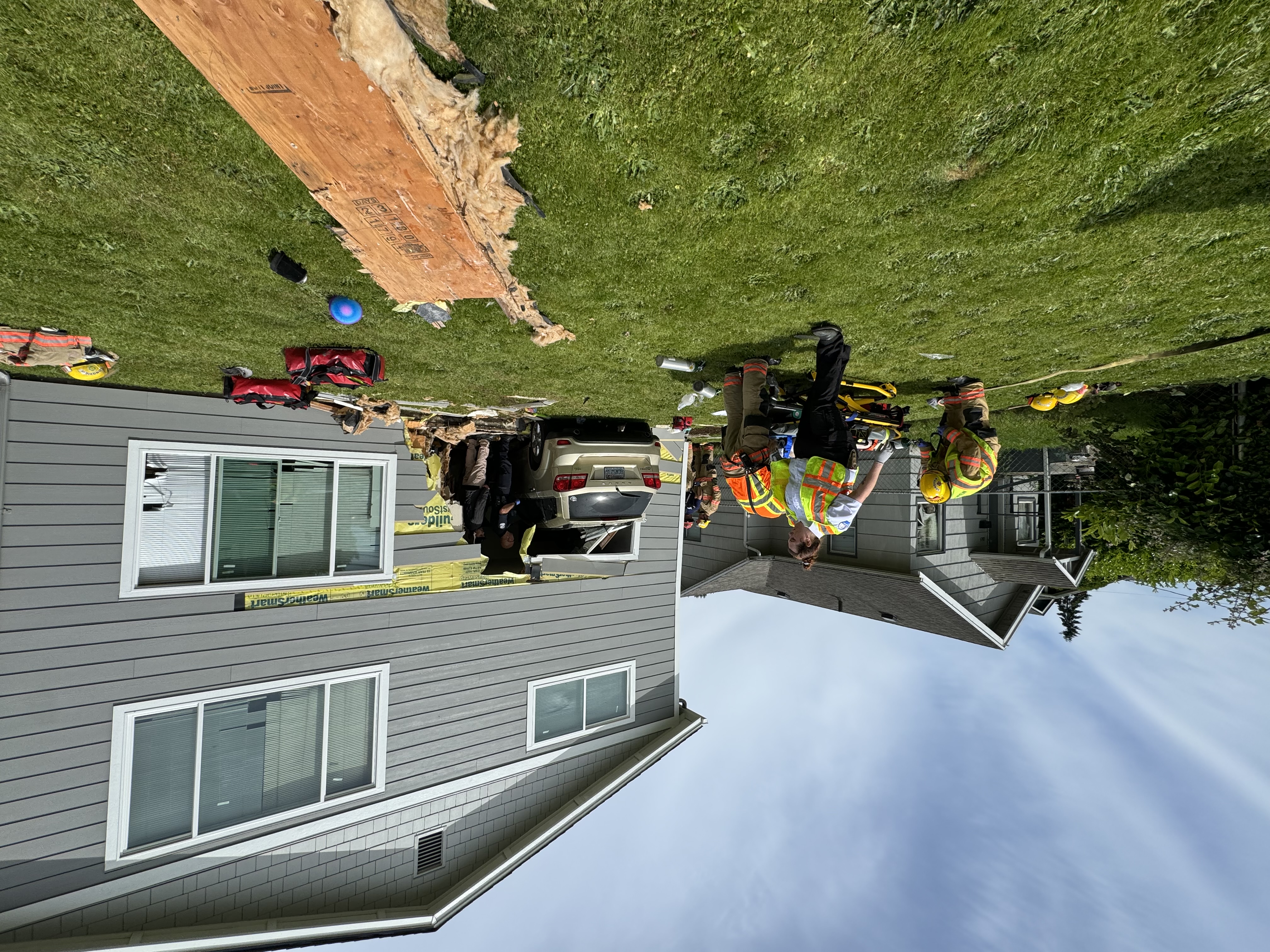 The first fire unit arrived at 11:24 AM and observed the minivan inside the apartment, an unconscious patent outside the van in the lawn, a trapped subject between the van and the inside wall of the apartment, and a third patient inside the van. Additional emergency crews and a LifeFlight helicopter were requested.