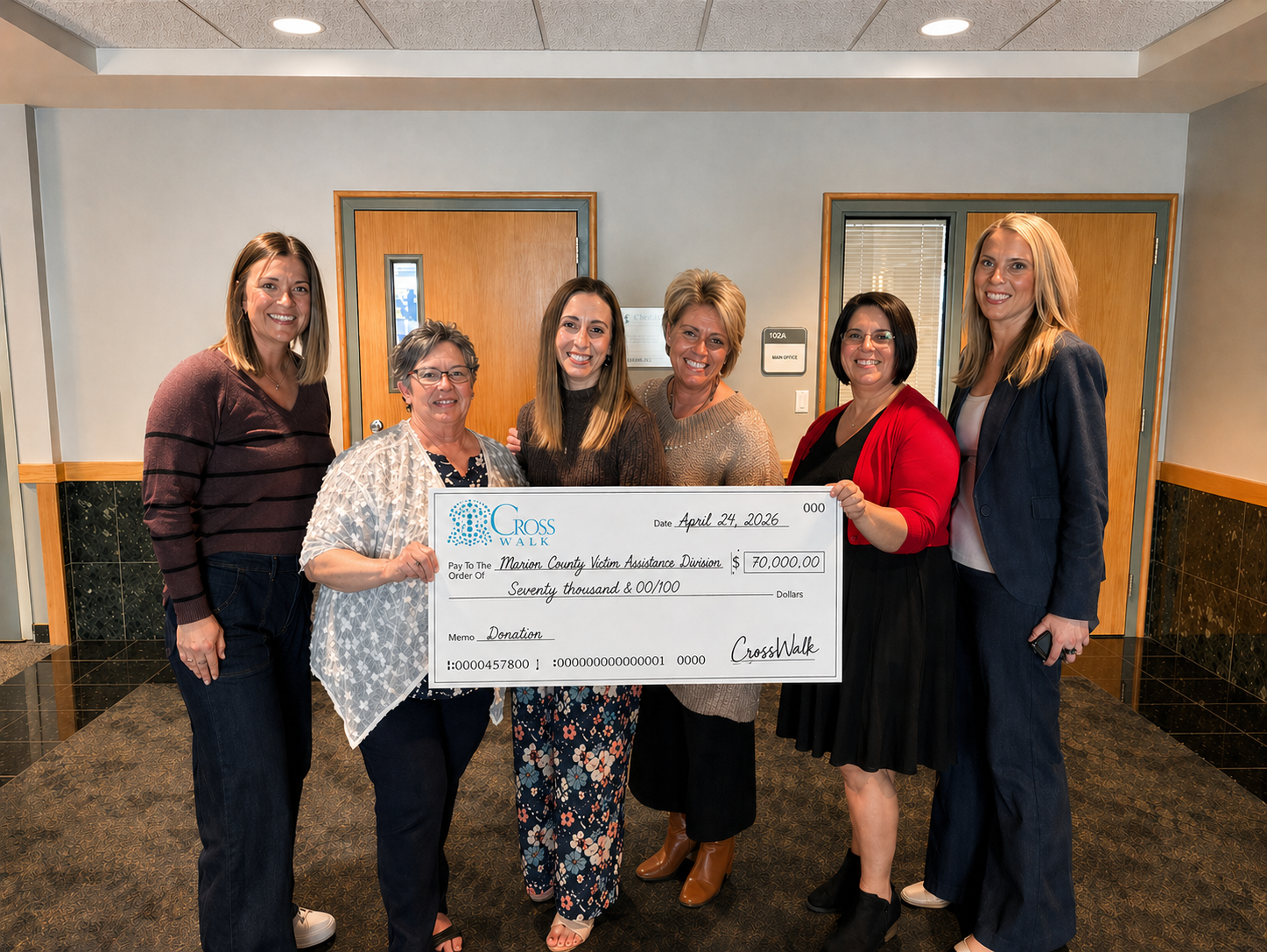 Salem, OR – April 28, 2026 – On March 7th of this year, the 14th annual CrossWalk fundraising event brought approximately 140 community members from Marion County together raising money in support of victims of crime. The 1.5 mile walk began and ended at the Gerry Frank Amphitheater at Salem’s Riverfront Park. On Friday April 24, 2026, representatives from CrossWalk presented Marion County District Attorney Paige Clarkson with a check for $70,000 – more than double the funds collected in 2025.