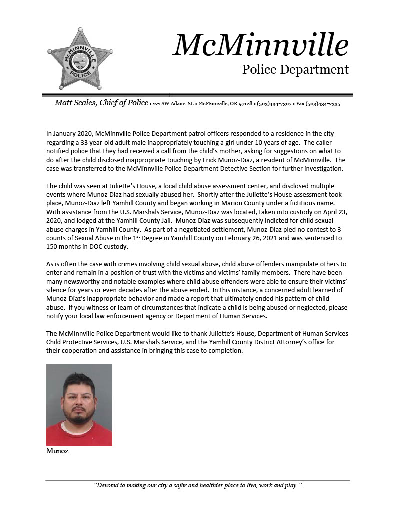 In January 2020, McMinnville Police Department patrol officers responded to a residence in the city regarding a 33 year-old adult male inappropriately touching a girl under 10 years of age. The caller notified police that they had received a call from the child’s mother, asking for suggestions on what to do after the child disclosed inappropriate touching by Erick Munoz-Diaz, a resident of McMinnville. The case was transferred to the McMinnville Police Department Detective Section for further investigation.