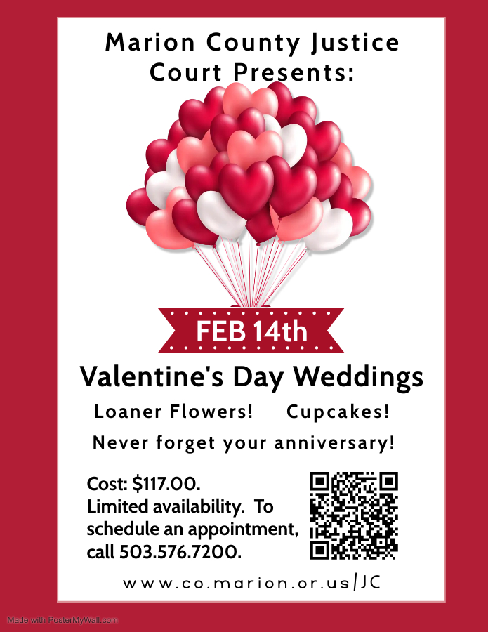 Love is in the Halls of Justice as Justice of the Peace Justin Kidd announces that the Marion County Justice Court will celebrate a "Day of Love" on February 14, 2024, by officiating marriages all day. The Court is building on last year’s event when ten couples married – in an event that the Oregon to rename us “Marryin’ County”.
