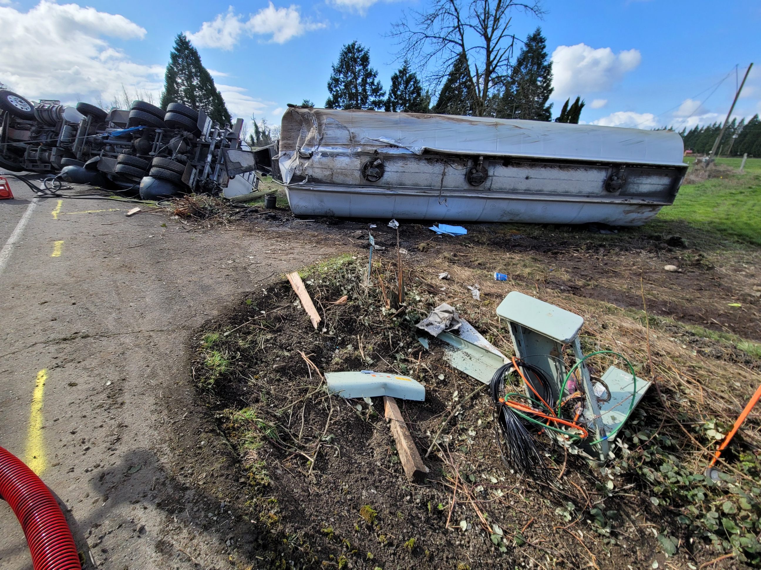On March 23rd, 2021, deputies were called to the scene of a crash involving a fuel tanker which overturned on Golf Club Road SE, Stayton. During the crash, a large quantify of fuel was spilled from the vehicle, leaving Golf Club Road closed for several days to allow time for hazardous materials cleanup crews to remove contaminated soil and for the roadway to be repaired.
