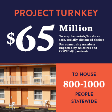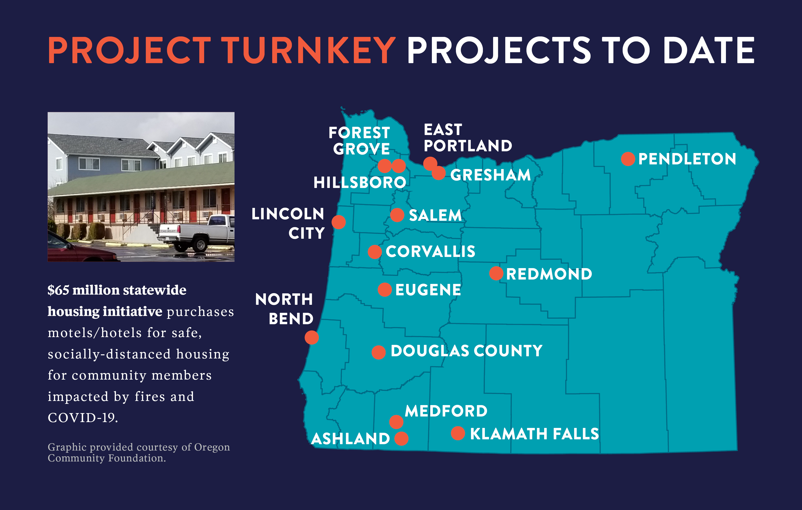 The Oregon Legislature allocated a total of $65 million for Project Turnkey for the purpose of acquiring motels/hotels for use as non-congregate shelter for people experiencing homelessness or at-risk of homelessness. Two discrete funds were provided by the state: one totaling $30 million to be awarded in counties and tribal communities impacted by the 2020 wildfires; and one totaling $35 million for the remaining 28 counties in the state. Oregon Community Foundation is administering both funds through an application and selection process, with guidance from an Advisory Committee of state, local, and community stakeholders. For more information, please visit Project Turnkey online.
