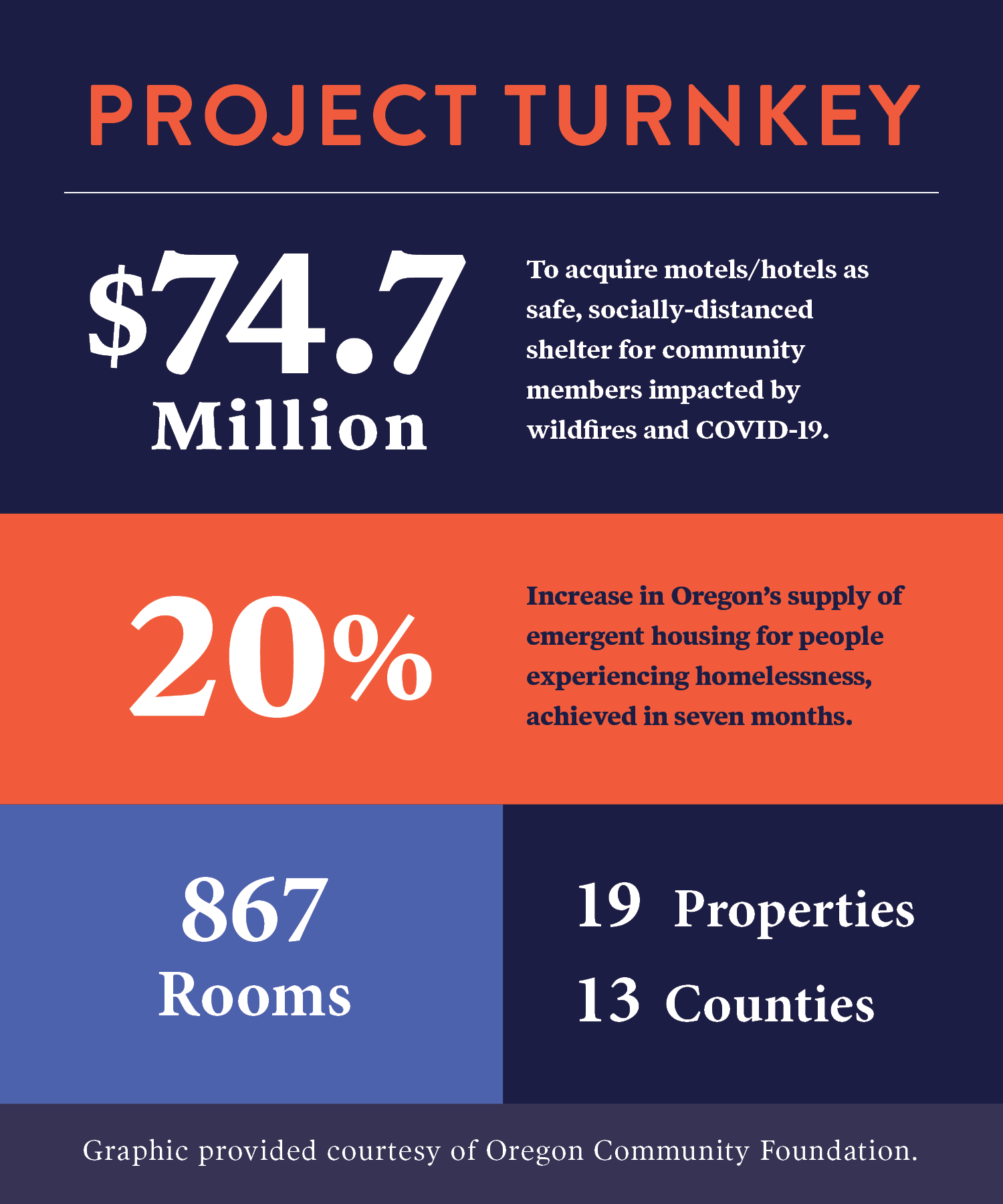 The Oregon Legislature allocated a total of $74.7 million for Project Turnkey for the purpose of acquiring motels/hotels for use as non-congregate shelter for people experiencing homelessness or at-risk of homelessness. Two discrete funds were provided by the state: one totaling $30 million to be awarded in counties and tribal communities impacted by the 2020 wildfires; and one totaling $44.7 million for the remaining 28 counties in the state. Oregon Community Foundation has successfully administered both funds through an application and selection process, with guidance from an Advisory Committee of state, local, and community stakeholders.