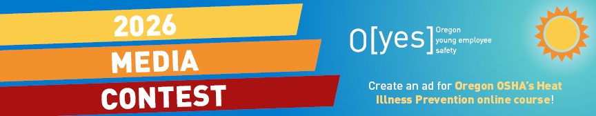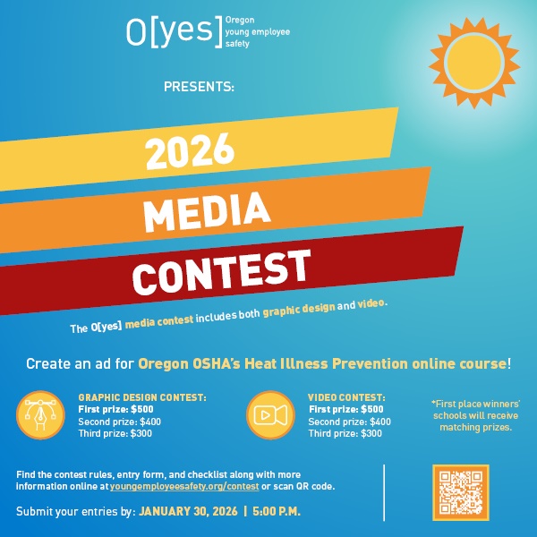 The 2026 media contest, organized by the Oregon Young Employee Safety (O[yes]) Coalition, calls on participants to create an ad – through a compelling graphic design or video – that captures the attention of teen workers and convinces them to take the Oregon Occupational Safety and Health Division’s (Oregon OSHA) heat-illness prevention online course. The idea is to show teen workers that the online course is an essential tool they can use to protect themselves from heat-related hazards while on the job – especially when they’re working during the summer months.